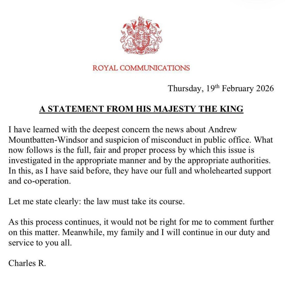 “คิงชาร์ลส์ที่ 3” ออกแถลงการณ์ด่วน หลัง “แอนดรูว์ เมาท์แบตเทน-วินด์เซอร์” ถูกจับกุม ทรงรับสั่งให้เป็นไปตามกฎหมาย