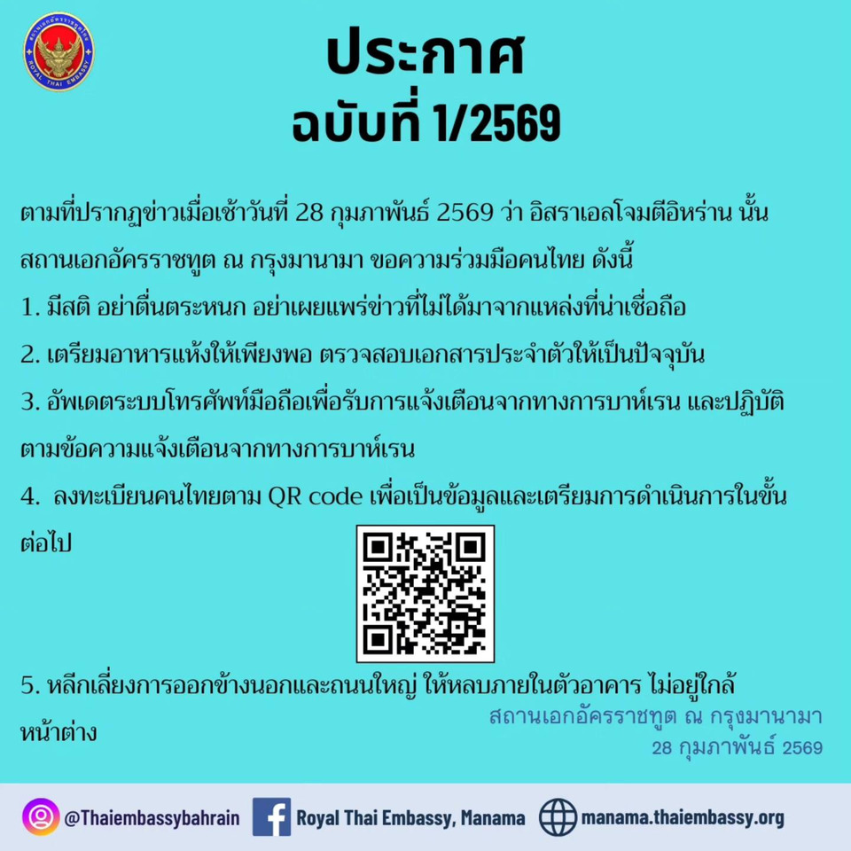 วันที่ 28 ก.พ.2569 สถานทูตเอกอัคราชทูตไทย ณ กรุงมานามา ประกาศแจ้งถึงคนไทย ระบุว่า