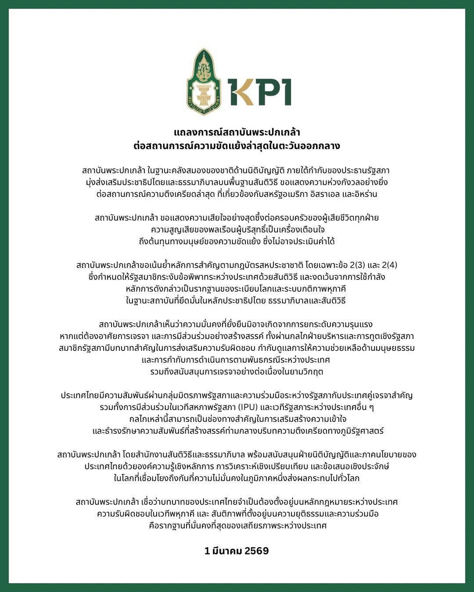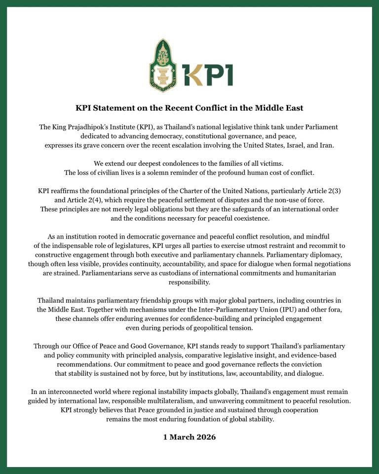 The King Prajadhipok’s Institute (KPI), as Thailand’s national legislative think tank under Parliament dedicated to advancing democracy, constitutional governance, and peace, expresses its grave concern over the recent escalation involving the United States, Israel, and Iran.