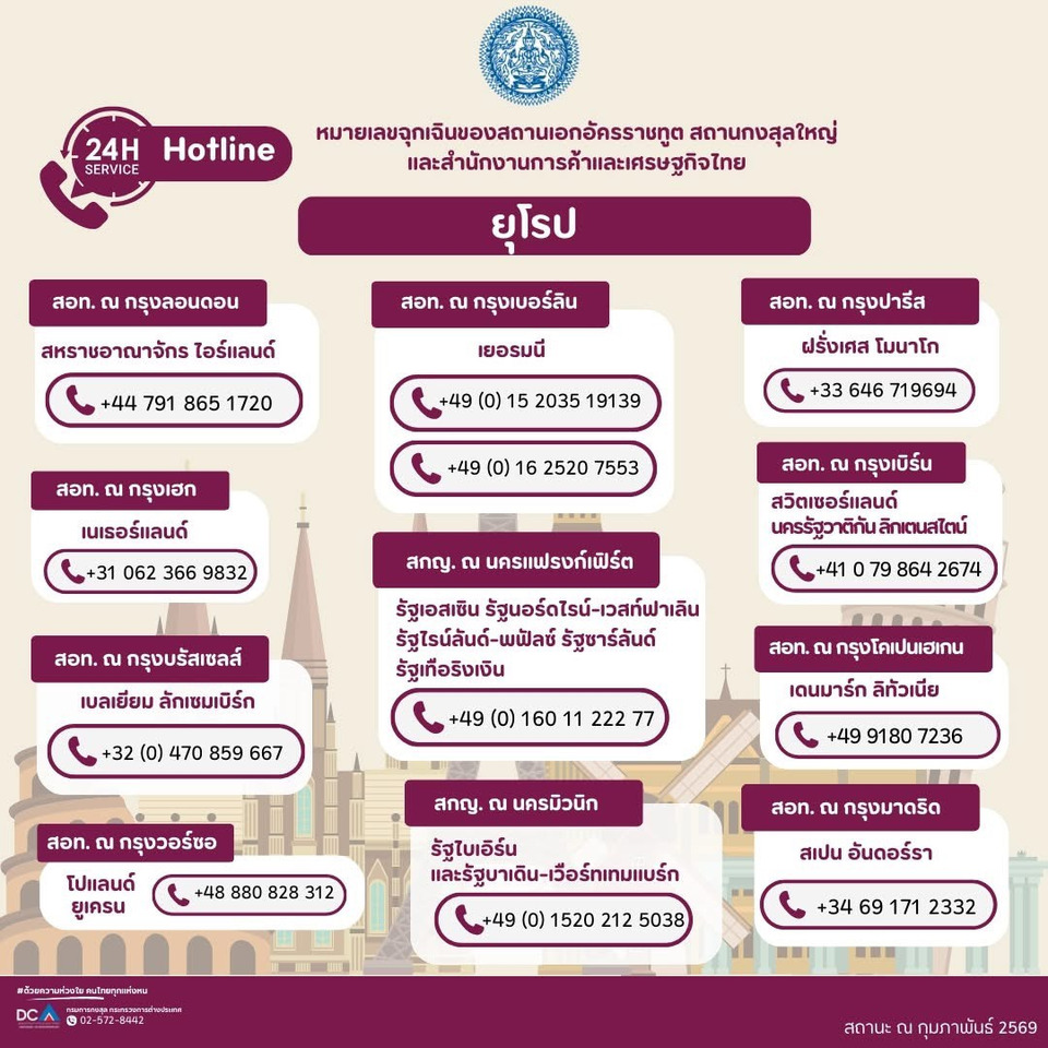 update หมายเลขฉุกเฉิน (Hotline) ของสถานเอกอัครราชทูต และสถานกงสุลใหญ่ไทยในต่างประเทศทั่วโลก (ประจำปี 2569) พกไว้อุ่นใจ ก่อนเดินทางไปต่างประเทศ