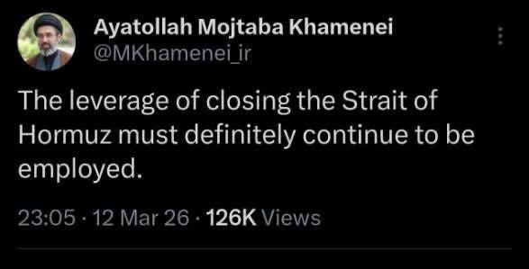 สถานการณ์ความตึงเครียดในตะวันออกกลางทวีความรุนแรงขึ้นอย่างต่อเนื่อง ล่าสุดเมื่อวันที่ 13 มีนาคม 2569 ตามรายงานจากเฟซบุ๊ก: สถานเอกอัครราชทูตสาธารณรัฐอิสลามอิหร่านในราชอาณาจักรไทย โพสต์ข้อความ ระบุว่า อายะตุลลอฮ์ โมจตาบา คาเมเนอี ผู้นำสูงสุดคนใหม่ของอิหร่าน ได้สื่อสารผ่านแพลตฟอร์ม X โดยระบุอย่างชัดเจนว่ามาตรการกดดันในการปิดช่องแคบฮอร์มุซจะต้องถูกนำมาใช้ต่อไปอย่างแน่นอน
