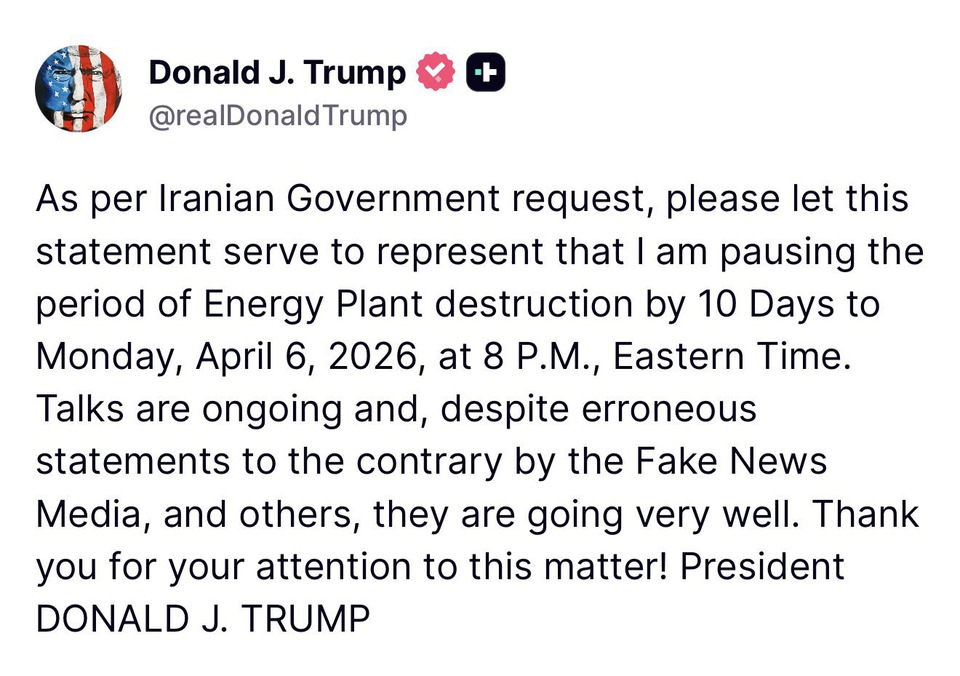 เมื่อวันที่ 27 มีนาคม 2569 ประธานาธิบดีโดนัลด์ เจ. ทรัมป์ ได้ประกาศระงับการทำลายโรงไฟฟ้าเป็นระยะเวลา 10 วัน ตามคำขอจากรัฐบาลอิหร่าน โดยการหยุดดำเนินการดังกล่าวจะมีผลถึงวันจันทร์ที่ 6 เมษายน 2569 เวลา 20:00 น. ตามเวลา Eastern Time (ET) โดยทรัมป์ได้ระบุว่า การเจรจาในเรื่องนี้กำลังดำเนินไปอย่างดี แม้จะมีข้อมูลที่คลาดเคลื่อนจากสื่อที่ไม่เป็นทางการ (Fake News) ที่พยายามบิดเบือนความจริง ซึ่งการเจรจากำลังดำเนินไปด้วยดี และจะมีการเปิดเผยข้อมูลเพิ่มเติมในอนาคต