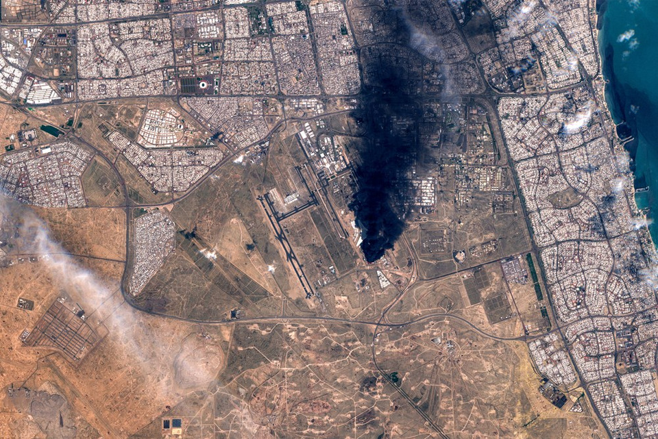 เมื่อวันที่ 27 มีนาคม 2566 ภาพถ่ายจากดาวเทียม Copernicus Sentinel-2 ขององค์การอวกาศยุโรป (ESA) แสดงให้เห็นกลุ่มควันลอยขึ้นในบริเวณใกล้เคียงสนามบินนานาชาติกุเวต หลังจากที่โดรนได้โจมตีถังน้ำมันและทำให้เกิดไฟไหม้ที่สนามบินดังกล่าว
