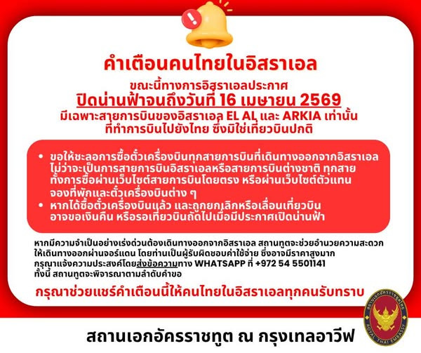 โดยระบุว่า “คำเตือนคนไทยในอิสราเอล ขณะนี้ทางการอิสราเอลประกาศปิดน่านฟ้า จนถึงวันที่ 16 เมษายน 2569 มีเฉพาะสายการบินของอิสราเอล EL AL และ ARKIA เท่านั้น ที่ทำการบินไปยังไทย ซึ่งมิใช่เที่ยวบินปกติ