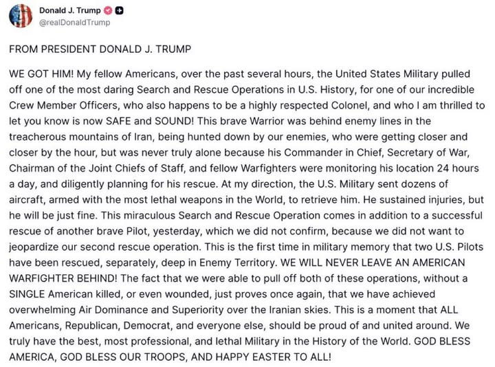 เมื่อวันที่ 5 เมษายน 2569 โดนัลด์ ทรัมป์ อดีตประธานาธิบดีสหรัฐฯ ได้โพสต์ข้อความผ่านโซเชียลมีเดีย ระบุว่า กองทัพสหรัฐฯ ประสบความสำเร็จในการปฏิบัติการค้นหาและกู้ภัย (Search and Rescue) หนึ่งในภารกิจที่ท้าทายที่สุดในประวัติศาสตร์