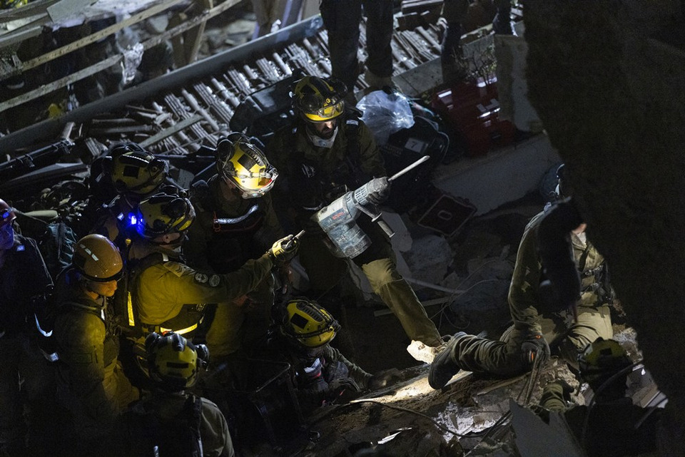 เจ้าหน้าที่ค้นหาและกู้ภัยของอิสราเอลได้ปฏิบัติการอย่างต่อเนื่อง ท่ามกลางซากปรักหักพัง โดยใช้เครื่องมือหนักและสุนัขดมกลิ่นเพื่อเพิ่มโอกาสในการค้นหาผู้รอดชีวิต
