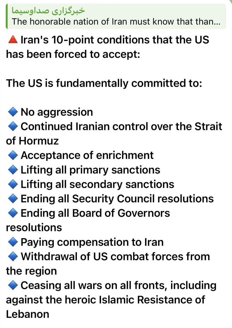อิหร่านประกาศรายละเอียด ข้อตกลง 10 ข้อ ที่จะเป็นพื้นฐานสำหรับสันติภาพระยะยาวในตะวันออกกลาง โดยมีสาระสำคัญดังนี้: