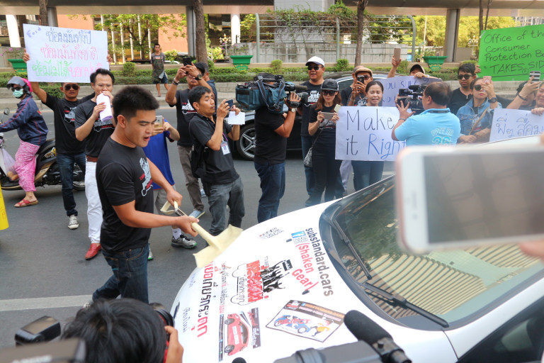 เมื่อเวลา 13.30 น.วันที่ 14 มี.ค. ที่บริเวณด้านหน้าสำนักงานใหญ่ บริษัท ฟอร์ด เซลส์ แอนด์ เซอร์วิส ประเทศไทย จำกัด อาคารสาทร สแควร์ ถนนนราธิวาสราชนครินทร์ เขตสาทร กรุงเทพฯ กลุ่มเหยื่อรถยนต์ ซึ่งเป็นผู้ที่ได้รับความเดือดร้อนจากปัญหาการใช้รถยนต์ยี่ห้อฟอร์ดรุ่นเฟียสต้าและรุ่นโฟกัส รวมตัวกันกว่า 60 คน เพื่ออ่านแถลงการณ์ข้อเรียกร้องของผู้บริโภคต่อบริษัทฟอร์ดพร้อมทั้งชูป้ายประณามบริษัทฟอร์ด