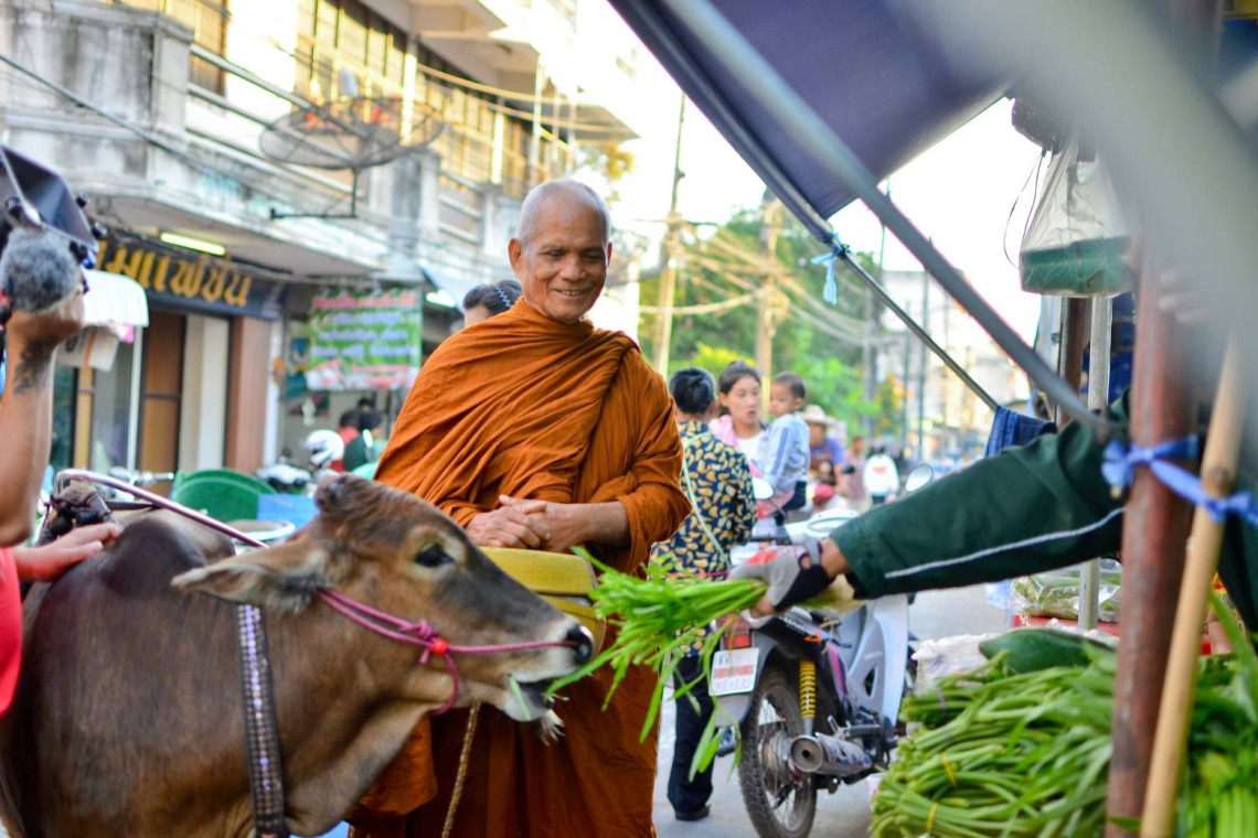 หลวงพ่อสุธี สำนักสงฆ์ที่โคราช ได้นำลูกวัวมาช่วยลากรถเข็นบรรทุกอาหารที่ญาติโยมนำมาใส่บาตร ในตลาดสดเทศบาลเมืองนครนายก เมื่อเวลา 07.00 น.ของวันที่ 6 มกราคม 2563 ที่ตลาดสดเทศบาลเมืองนครนายก ผู้สื่อข่าวได้พบหลวงพ่อสุธี อยู่ที่ สำนักสงฆ์โคราช รูปหนึ่งได้นำลูกวัวพันธุ์ไทย เพศผู้ อายุ 2 ปี สีน้ำตาล เดินช่วยลากรถเข็นรับสิ่งของที่หลวงพ่อรับบิณฑบาต ในตลาดสดเทศบาลเมืองนครนายก โดยมีประชาชน พ่อค้า แม่ค้าให้ความสนใจนำปัจจัย อาหารสำเร็จรูป ผลไม้ และสิ่งของ มาใส่บาตร เป็นจำนวนมาก เนื่องจากในจังหวัดนครนายก ไม่เคยพบพระสงฆ์ นำวัวออกมาช่วยลากรถเข็นรับสิ่งของบิณฑบาตสร้างความแปลกและเป็นที่ฮือฮาแก่ประชาชน พ่อค้า แม่ค้า ในตลาดสด จากการสอบถามหลวงพ่อสุธี สำนักสงฆ์ ที่โคราช เล่าว่าได้มาทำธุระที่นครนายก ได้นำลูกวัวเพศผู้สีน้ำตาล อายุ 2 ปี ชื่อว่าแรมโบ้ ขึ้นรถตู้มาด้วย และในเช้าวันนี้ได้ออกมารับบิณฑบาตโปรดญาติโยม โดยให้เจ้าแรมโบ้ช่วยลากรถเข็นบรรทุกสิ่งของที่ญาติโยมนำมาใส่บาตร ที่จังหวัดนครนายกดังกล่าว