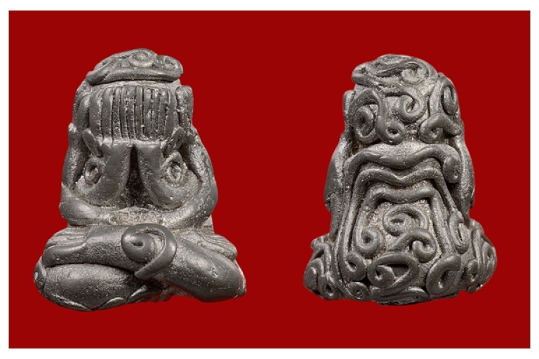 ด้านหลังองค์พระตรงกลางเป็นยันต์เฑาะว์อุณาโลมหางสะบัดขึ้นด้านบนเศียร หรืออาจเป็นตัวอักขระขอมตัวอื่น ด้านข้างตัวเฑาะว์อุณาโลมเป็นตัวอุณาโลมขนาบข้าง 2 ตัว ด้านล่างเป็นอักขระว่า "นะ มะ พะ ทะ" ใต้ฐานองค์พระเป็นแอ่งลึก