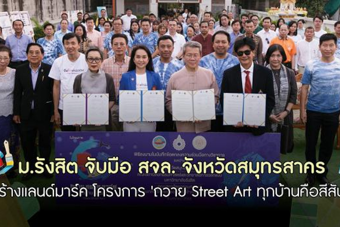 เสริมศักยภาพท่องเที่ยวแบบ วัน เดย์ ทริป ให้นักท่องเที่ยว สร้างรายได้ให้ชุมชน มหาวิทยาลัยรังสิต ลงนามความร่วมมือทางวิชาการ ร่วมกับสถาบันเทคโนโลยีพระจอมเกล้าเจ้าคุณทหารลาดกระบัง และจังหวัดสมุทรสาคร” สร้างสรรค์งานในโครงการ “ถวาย Street Art ทุกบ้านคือสีสัน” เพื่อเสริมศักยภาพการท่องเที่ยวแบบ One Day Trip ให้นักท่องเที่ยว สร้างรายได้ให้กับชุมชน สำหรับโครงการ “ถวาย Street Art ทุกบ้านคือสีสัน” เป็นกิจกรรมหนึ่งที่เกิดขึ้นจากการนำผังพัฒนาพื้นที่เฉพาะตลาดมหาชัย และผังพัฒนาพื้นที่เฉพาะชุมชนท่าฉลอม จังหวัดสมุทรสาคร เพื่อส่งเสริมการท่องเที่ยวชุมชน ซึ่งดำเนินการวางและจัดทำผังโดยกองผังเมืองเฉพาะ กรมโยธาธิการและผังเมือง ไปสู่การปฏิบัติจริงโดยจังหวัดสมุทรสาคร โครงการนี้อยู่ภายใต้แผนพัฒนาโครงการพัฒนาเส้นทางเชื่องโยงการท่องเที่ยว (สถานีรถไฟบ้านแหลม-ท่าเรือท่าฉลอม) และโครงการพัฒนาและส่งเสริมการท่องเที่ยวชุมชนท่าฉลอม (ชุมชนสุขาภิบาลแห่งแรก) ของผังพัฒนาพื้นที่เฉพาะ มีวัตถุประสงค์เพื่อปรับปรุงภูมิทัศน์ชุมชนท่าฉลอมให้เกิดความสวยงาม สามารถพัฒนาเป็นแหล่งท่องเที่ยวเชิงศิลปะที่คงความงดงามของภูมิสถาปัตย์ สะท้อนประเพณี วัฒนธรรมและประวัติศาสตร์ อันเป็นอัตลักษณ์ของชุมชนท่าฉลอม โดยการมีส่วนร่วมของหน่วยงานภาครัฐ ภาคเอกชน และประชาชนในพื้นที่ นายวีระศักดิ์ วิจิตร์แสงศรี ผู้ว่าราชการจังหวัดสมุทรสาครกล่าวว่า “โครงการดังกล่าวเป็นการพัฒนาพื้นที่ให้ดีขึ้นเพื่อส่งเสริมการท่องเที่ยวในจังหวัด ซึ่งได้เห็นถึงศักยภาพของสถาบันการศึกษาที่มีความพร้อมทั้งกำลังคนและพลังความคิดสร้างสรรค์ที่จะช่วยพัฒนา การลงนามบันทึกข้อตกลงความร่วมมือทางวิชาการครั้งนี้ภายใต้โครงการ “ถวาย Street Art ทุกบ้านคือสีสัน เราได้รับความร่วมมือเป็นอย่างดีจาก ผศ.ดร.นฤพนธ์ ไชยยศ คณะสถาปัตยกรรมศาสตร์ รศ.พิศประไพ สาระศาลิน คณบดีวิทยาลัยการออกแบบ จากมหาวิทยาลัยรังสิต และผศ.ดร.อันธิกา สวัสดิ์ศรี คณบดีคณะสถาปัตยกรรมศาสตร์ สถาบันเทคโนโลยีพระจอมเกล้าเจ้าคุณทหารลาดกระบัง มาร่วมมือกันสร้างสรรค์ผลงาน Street Art เล่าเรื่องราวของ วิถีชีวิตชุมชน และประวัติศาสตร์ท้องถิ่น บนกำแพง จำนวน 9 ภาพ ฝาท่อระบายน้ำ จำนวน 50 ฝา และองค์ประกอบของถนนอื่นๆ ตลอดเส้นทางถนนถวาย ตำบลท่าฉลอม อำเภอเมืองสมุทรสาคร จังหวัดสมุทรสาคร เป็นการส่งเสริมการท่องเที่ยวชุมชน ภายใต้แนวความคิด “ท่องเที่ยว เก๋ไก๋ มหาชัยคลาสสิก ท่องเที่ยวชิคชิค ท่าฉลอมวินเทจ” ซึ่งจะแล้วเสร็จภายในเดือนมีนาคมนี้ สำหรับ