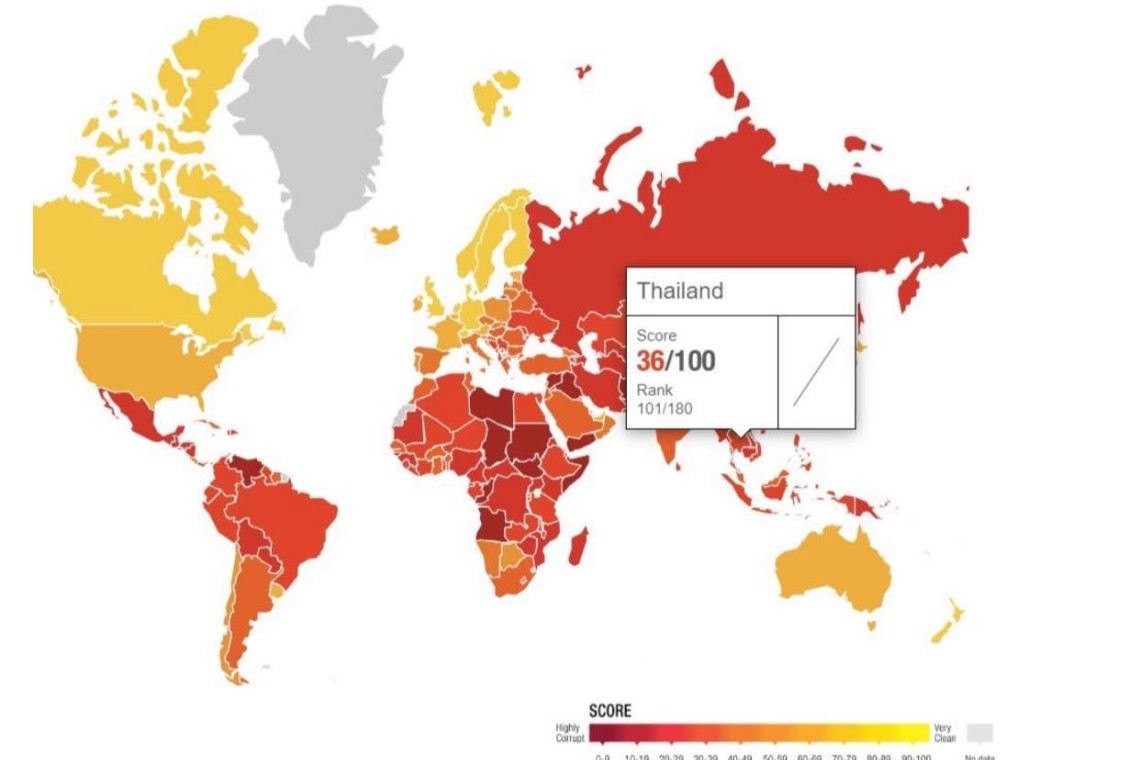 องค์การเพื่อความโปร่งใสนานาชาติ ( Transparency International) เผยแพร่ค่าคะแนนดัชนีรับรู้การทุจริตประจำปี 2019 (CPI) พบว่า ประเทศไทย ถูกจัดอยู่ในอันดับที่ 101 จากจำนวนทั้งหมด 180 ประเทศ และได้ค่าเฉลี่ยดัชนีที่ 36 (จากคะแนนเต็ม 100) ซึ่งเท่ากับค่าดัชนีในปี 2018 แต่อันดับถือว่าหล่นลง เนื่องจากในการจัดอันดับปี 2018 ไทยอยู่ในอันดับที่ 99 จาก 180 ประทศ (ประเทศที่อันดับตัวเลขยิ่งสูงหมายถึงยิ่งมีการคอร์รัปชันมาก)