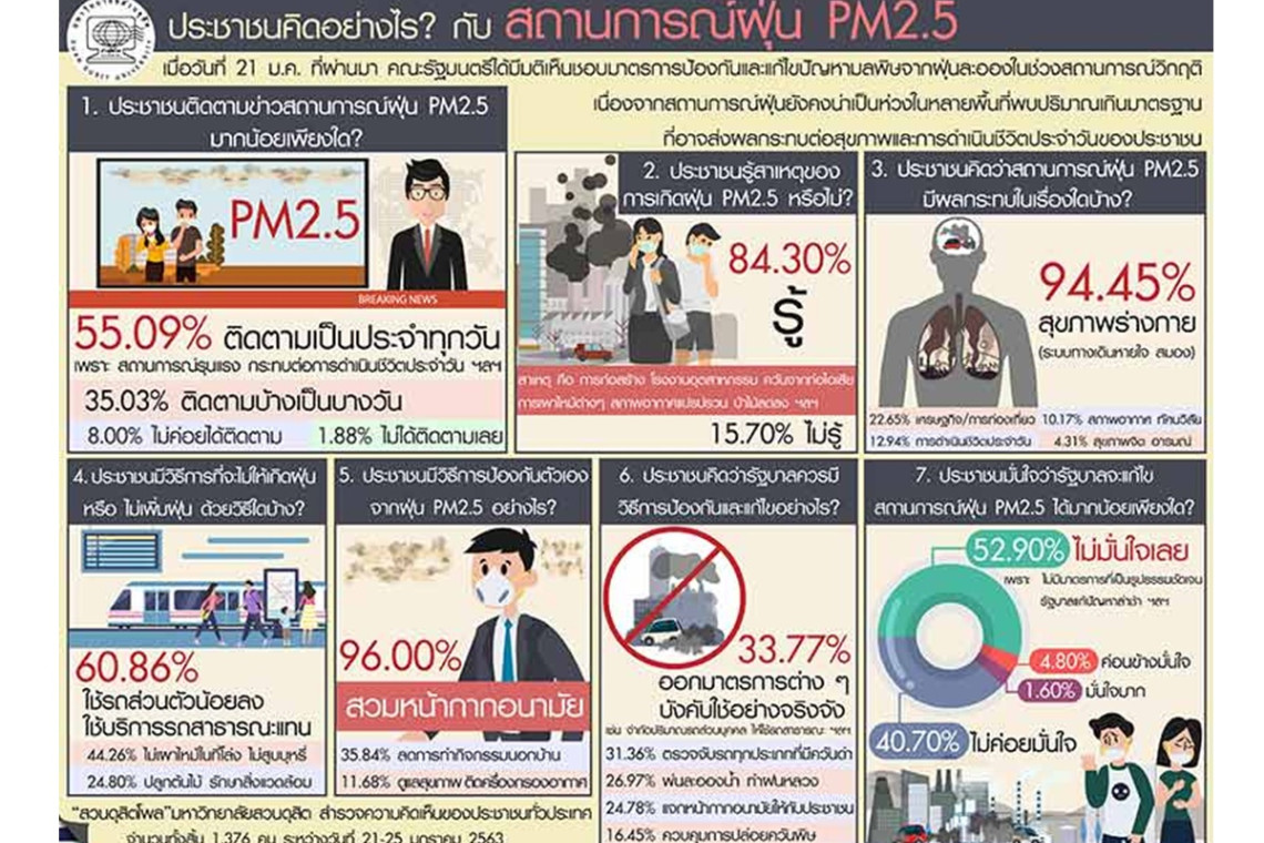 “สวนดุสิตโพล” มหาวิทยาลัยสวนดุสิต เปิดเผยผลสำรวจ เพื่อสะท้อนความคิดเห็นของประชาชนทั่วประเทศ ต่อ สถานการณ์ฝุ่น PM2.5 จำนวนทั้งสิ้น 1,376 คน ระหว่างวันที่ 21-25 ม.ค.ที่ผ่านมาหลัง คณะรัฐมนตรี มีมติเห็นชอบมาตรการป้องกันและแก้ไขปัญหา เนื่องจากสถานการณ์ยังคงน่าเป็นห่วง พบปริมาณเกินมาตรฐานที่อาจส่งผลกระทบต่อสุขภาพและการดำเนินชีวิตประจำวันของประชาชน พบว่า ร้อยละ ติดตามข่าว สถานการณ์ฝุ่นทุกวัน ขณะที่ ร้อยละ 35.03 ติดตามบ้างบางวัน โดยที่ ร้อยละ 84.30 รู้ว่าสาเหตุเกิดจากตัวเอง โรงงานอุตสาหกรรม ท่อไอเสียรถยนต์ ขณะที่ ร้อยละ 94.45 กังวล PM2.5 กระทบสุขภาพ ระบบทางเดินหายใจ , ร้อยละ 22.65 กระทบเศรษฐกิจและการท่องเที่ยว ส่วนวิธีการป้องกันร้อยละ 96.00 ระบุสวมหน้ากากอนามัย ร้อยละ 35.84 ลดการทำกิจกรรมนอกบ้าน อยู่บ้านมากขึ้น หลีกเลี่ยงสถานที่ที่มีฝุ่น