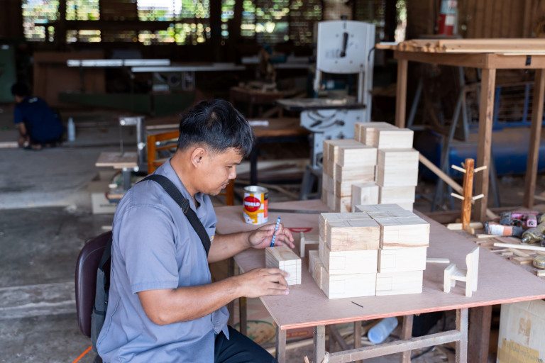 ศูนย์พัฒนาอาชีพคนตาบอดของมูลนิธิช่วยคนตาบอดแห่งประเทศไทย ในพระบรมราชินูปถัมภ์” เป็นสถานที่ฝึกอาชีพสำหรับผู้ที่พิการทางสายตา ซึ่งอาชีพหลักของพวกเขาคือ “อาชีพช่างไม้” พวกเขาทำงานร่วมกับเครื่องจักรที่มีความเสี่ยงเป็นอย่างมาก สำหรับคนที่มองไม่เห็นแล้ว ถือเป็นเรื่องยากที่จะประดิษฐ์ชิ้นงานออกมาให้สวยงามได้ แต่ที่ศูนย์พัฒนาอาชีพฯ แห่งนี้มุ่งช่วยผู้พิการทางสายตาให้มีอาชีพ มีการฟื้นฟูพัฒนาสมรรถภาพให้กับผู้พิการทางสายตา ทำให้ชิ้นงานออกมาสวยงาม นอกจากนี้พวกเขายังประดิษฐ์เครื่องมือเครื่องใช้ในครัวเรือนที่ทำด้วยไม้ และยังมีผลิตภัณฑ์อื่น ๆ อาทิ โต๊ะสนาม ตู้เสื้อผ้า เตียงนวดแผนไทย ซึ่งผลิตภัณฑ์เหล่านี้ทำจากไม้เนื้อแข็ง สามารถเคลื่อนย้ายได้ เป็นผลงานจากผู้ที่มีความบกพร่องทางสายตาแต่ได้รับการฝึกฝนอบรมทักษะจนชำนาญจากศูนย์ฝึก และสามารถผลิตสินค้าออกจำหน่ายเพื่อสร้างรายได้ให้แก่ตนเอง