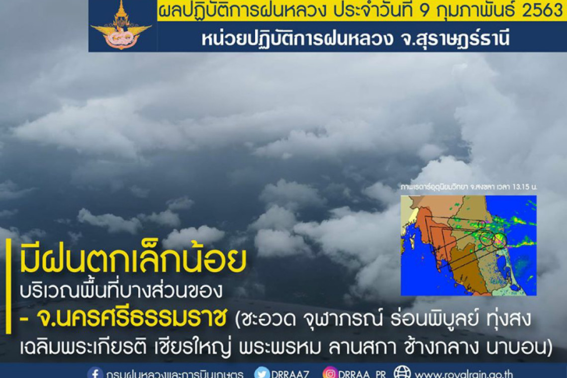 สำหรับผลการปฏิบัติการฝนหลวงเมื่อวานนี้ (9 ก.พ.63) หน่วยปฏิบัติการฝนหลวง จ.สุราษฎร์ธานี ได้ขึ้นบินปฏิบัติการฝนหลวงช่วยเหลือพื้นที่การเกษตรที่มีการร้องขอ ทำให้มีฝนตกเล็กน้อยบริเวณ อ.ชะอวด จุฬาภรณ์ ร่อนพิบูลย์ ทุ่งสง เฉลิมพระเกียรติ เชียรใหญ่ พระพรหม ลานสกา ช้างกลาง และนาบอน จ.นครศรีธรรมราช