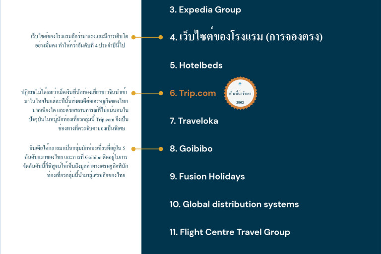 ทั้งนี้ทาง SiteMinder ได้เผยอันดับสุดยอดแพลตฟอร์มจองโรงแรมจากรายได้การจองประจำปี 2019 ชี้การแข่งขันเดือดทั้งการจองตรงและผู้นำในตลาด โดยผลสำรวจจากรายได้เว็บไซต์การจองที่พักทำให้เห็นมูลค่าตลาดนักท่องเที่ยวอินเดียและจีน ที่ถือเป็นส่วนสำคัญในอุตสาหกรรมท่องเที่ยวไทย สำหรับสุดยอด 12 แพลตฟอร์มจองโรงแรมในประเทศไทยประจำปีพ.ศ.2562 เมื่อประเมินจากรายได้รวมที่สร้างให้กับลูกค้าธุรกิจโรงแรมของ SiteMinder ได้แก่ 1.Booking.com 2.Agoda 3.Expedia Group 4.เว็บไซต์โรงแรม (การจองตรง)5.Hotelbeds 6.Trip.com 7.Traveloka 8.Goibibo 9.Fusion Holidays 10.Global Distribution System 11.Flight Centre Travel Group 12.Destinations of the World จาก WebBeds และ 12 อันดับช่องทางการจองยอดนิยม รายชื่อที่น่าจับตามองที่สุด คือ Goibibo ถือเป็นตัวชี้วัดถึงยอดการเติบโตของนักท่องเที่ยวชาวอินเดีย เนื่องจากในปัจจุบันอินเดียถือเป็น 1 ใน 5 ตลาดหลักของนักท่องเที่ยวที่เดินทางมาประเทศไทย