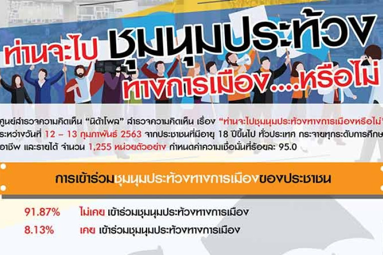 “นิด้าโพล” สถาบันบัณฑิตพัฒนบริหารศาสตร์ (นิด้า) เผยผลสำรวจของประชาชน ที่มีอายุ 18 ปีขึ้นไป กระจายทุกภูมิภาค ระดับการศึกษา และอาชีพทั่วประเทศ รวมทั้งสิ้น จำนวน 1,255 หน่วยตัวอย่าง เรื่อง “ท่านจะไปชุมนุมประท้วงทางการเมืองหรือไม่” ทำการสำรวจระหว่างวันที่ 12 – 13 กุมภาพันธ์ 2563 เมื่อถามถึงการเข้าร่วมชุมนุมประท้วงทางการเมืองของประชาชน พบว่า ส่วนใหญ่ ร้อยละ 91.87 ระบุว่า ไม่เคยเข้าร่วมชุมนุมประท้วงทางการเมือง ขณะที่ร้อยละ 8.13 ระบุว่า เคยเข้าร่วมชุมนุมประท้วงทางการเมือง