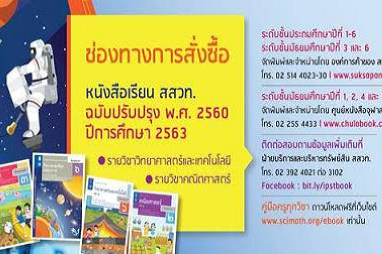 สถาบันส่งเสริมการสอนวิทยาศาสตร์และเทคโนโลยี (สสวท.) แจ้งว่า เพื่อเตรียมความพร้อมรับเปิดเทอมใหม่ โรงเรียนสามารถสั่งซื้อหนังสือเรียนวิทยาศาสตร์ คณิตศาสตร์ และเทคโนโลยี ของสถาบันส่งเสริมการสอนวิทยาศาสตร์และเทคโนโลยี (สสวท.) ชั้นประถมศึกษาปีที่ 1–6 , มัธยมศึกษาปีที่ 3และปีที่ 6สั่งซื้อที่องค์การค้าของ สกสค.โทร.0-2514-4023-30 www.suksapanpanit.com สำหรับหนังสือเรียนชั้นมัธยมศึกษาปีที่ 1ปีที่ 2 ปีที่ 4 และ ปีที่ 5สั่งซื้อได้ที่ศูนย์หนังสือแห่งจุฬาลงกรณ์มหาวิทยาลัย โทร.0-2255-4433 www.chulabook.com