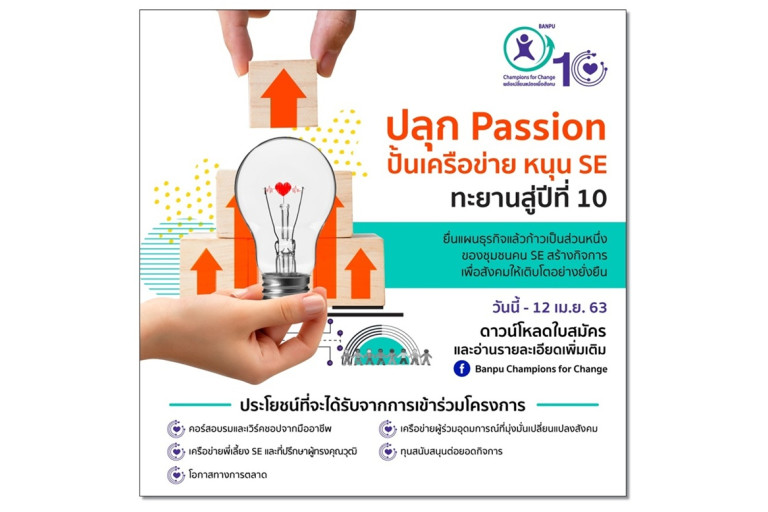 โดยเปิดรับสมัครแล้วตั้งแต่วันนี้ถึง 12 เมษายน 2563 ผู้สนใจสามารถดูรายละเอียดเพิ่มเติมได้ที่เฟซบุ๊ก Banpu Champions for Change พร้อมเตรียมพบความพิเศษในปีนี้กับSE School on Campus เวทีถ่ายทอดประสบการณ์ตรงในการทำกิจการเพื่อสังคมแก่ผู้ประกอบการ นักศึกษา และบุคคลทั่วไปทั้งในกรุงเทพฯ และต่างจังหวัด เพื่อเชื่อมโยงการเรียนรู้บนแพลตฟอร์มออนไลน์ SE School สู่กิจกรรมภาคปฏิบัติ ที่จะชวนปลุกแรงบันดาลใจ ต่อยอดไอเดียธุรกิจให้เติบโตทั้งในด้านรายได้และผลกระทบเชิงบวกต่อสังคม ชุมชน และสิ่งแวดล้อม