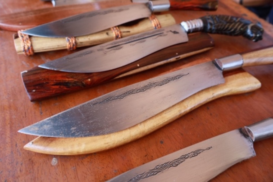 นายวิษณุ กล่าวเพิ่มเติมว่า สำหรับวิธีการตีมีด อุปกรณ์สำคัญคือ เหล็กแหนบรถยนต์ ซึ่งหาซื้อมาจากร้านขายของเก่า นำไปเผาไฟให้แดง ใช้เหล็กสกัดตัดขึ้นรูป อยากได้มีดรูปทรงอะไรก็ตัดเอา จากนั้นก็ตีเหล็กให้แบน เรียกว่า นวด หรือ ตีกะเนิน สมัยก่อนใช้แรงงานคนนวดล้วนๆ ปัจจุบันมีเครื่องทุ่นแรง เป็นเครื่องอัดไฮดรอลิก ช่วยประหยัดเวลาและแรงงาน เอาเหล็กเข้าเตาไฟแดงๆ 4-5 ครั้ง แล้วตีขึ้นรูปตามต้องการ ทิ้งให้เย็น แล้วเจียด้วยเครื่อง สมัยโบราณไม่มีเครื่องเจียก็ใช้ตะไบขัดเอา ขัดจนขาวได้คม จากนั้นก็ใส่ด้าม ด้ามทำจากไม้เนื้อแข็ง ใส่ด้ามแล้วเจียด้ามให้กลมเนียน เสร็จแล้วแต่งสันมีด เขียนลวดลายบนใบมีดด้วยเหล็กสกัด