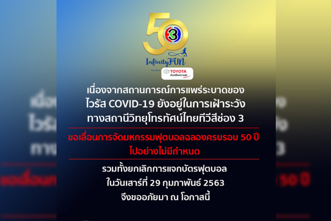 มีรายงานว่า สถานีวิทยุโทรทัศน์ช่อง 3 เผยว่า เนื่องจากสถานกาณณ์การแพร่ระบาดของ ไวรัส COVID-19 ยังอยู่ในการเฝ้าระวังทางสถานีวิทยุโทรทัศน์ไทยทีวีสีช่อง3 ขอเลื่อนการจัดมหกรรมฉลองครบรอบ 50 ปี ไปอย่างไม่มีกำหนด รวมทั้งยกเลิกการแจกบัตรฟุตบอล ในวันเสาร์ ที่ 29 กุมภาพันธ์ 2563 จึงขออภัยมาณโอกาสนี้ นอกจากนี้ ยังได้ขอเลื่อนการจัดกิจกรรมตลาดนัดดาราพาเหรด ครั้งที่ 1 ในวันเสาร์ที่ 29 กุมภาพันธ์ และวันอาทิตย์ที่ 1 มีนาคม 2563 ที่ศูนย์การค้าเซนทรัลพลาซ่าปิ่นเกล้าด้วย