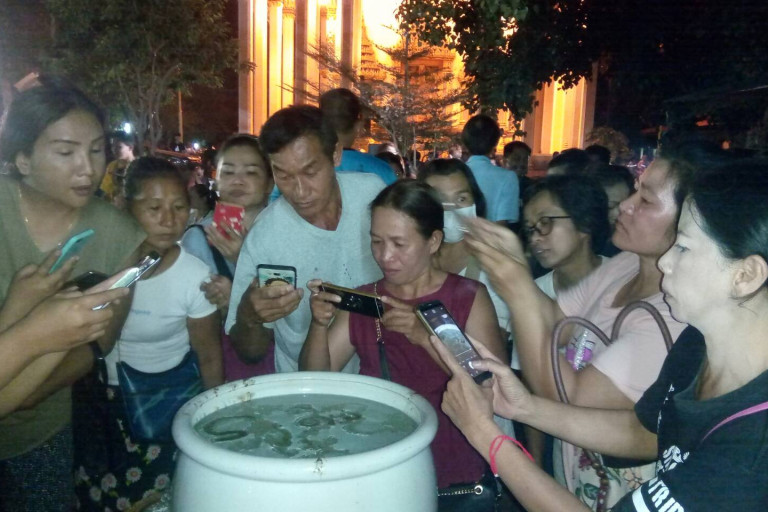 ก่อนวันหวยออกในงวดนี้ ชาวบ้านและคอหวยได้นำดอกไม้ ธูป เทียน แป้ง เข้าทำการขอโชคลาภ และ บางคนต่างนำโทรศัพท์มือถือถ่ายอ่างน้ำมนต์และมองเห็นตัวเลขที่ตนเองใช้แป้งลูบทาถูแตกต่างกันไป โดยบางคนจะระบุว่า เห็นเป็นเลข 225 , 223 , 375 , 589 , 893 , 935 ส่วนเลข 2 ตัว 87, 28 , 75, 58 , 68 , 39 , 35 และ 56