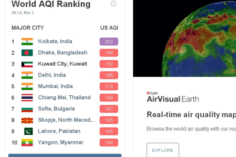 ด้าน www.airvisual.com ซึ่งรายงานคุณภาพอากาศและจัดอันดับเมืองมลพิษ โดยรายงานแบบเรียลไทม์ วันที่ 2 มี.ค.63 เวลา 08.14 น. พบว่า เช้านี้ เมืองเชียงใหม่ อยู่ในลำดับที่ 6 ของโลก ค่าฝุ่นอยู่ที่ 168 US AQI และกทม. อยู่ในลำดับที่ 28 ค่าฝุ่นอยู่ที่ 83 US AQI