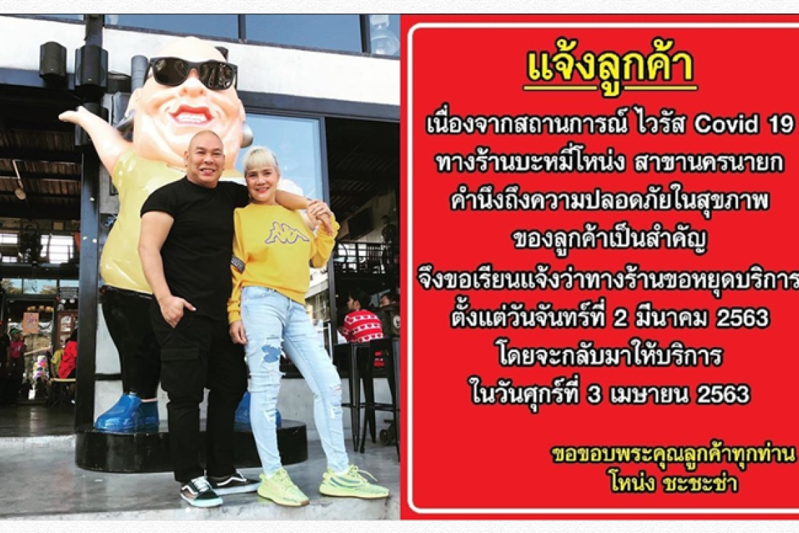 เมื่อสถานการณ์ไวรัสโควิด-19 มีความรุนแรงขึ้น นักแสดงตลกโหน่ง ชะชะช่า โพสต์อินสตาแกรม ส่วนตัว nong_chachacha ประกาศแจ้งการปิดร้านบะหมี่โหน่ง สาขานครนายก โดยระบะว่า..
