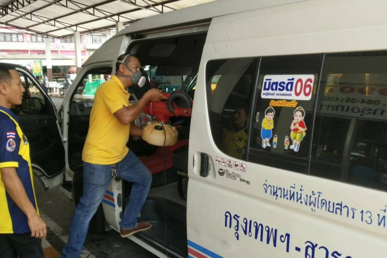 สันนิบาตเทศบาลจังหวัดจันทบุรี ร่วมหลายหน่วยงานออกฉีดพ่นยาฆ่าเชื้อในรถโดยสาร และรถตู้สาธารณะ ที่ผ่านเข้าออกสถานีขนส่งจันทบุรี เพื่อป้องกันไวรัสโคโรนา