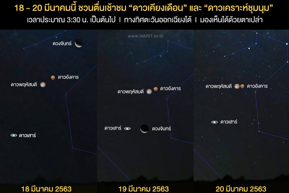 18 มีนาคม 2563 ดาวอังคารเคียงดวงจันทร์เสี้ยว ข้างแรม 10 ค่ำ ห่างประมาณ 5 องศา และดาวอังคารเคียงดาวพฤหัสบดี ห่างประมาณ 1.5 องศา