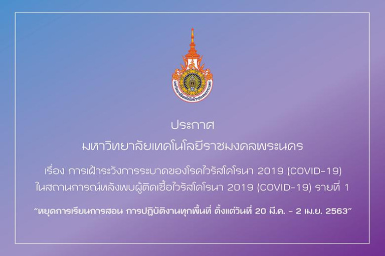 เมื่อวันที่ 19 มี.ค.63 รศ.สุภัทรา โกไศยกานนท์ รักษาราชการแทนอธิการบดี มหาวิทยาลัยเทคโนโลยีราชมงคลพระนคร ออกประกาศ เรื่อง การเฝ้าระวังการระบาดของโรคไวรัสโคโรนา 2019 (COVID-19) ในสถานการณ์หลังพบผู้ติดเชื้อไวรัสโคโรนา 2019 (COVID-19) รายที่ 1 โดยระบุว่า เนื่องด้วยนักศึกษาคณะบริหารธุรกิจ 1 ราย ติดเชื้อไวรัสโคโรนา 2019 (COVID-19) จากการตรวจโดยห้องปฏิบัติการโรงพยาบาลรามาธิบดี และกรมควบคุมโรคได้รับนักศึกษาดังกล่าวเพื่อดูแลและติดตามอาการตามขั้นตอนทางการแพทย์เรียบร้อยแล้ว มหาวิทยาลัยจึงขอประกาศหยุดการเรียนการสอน การปฏิบัติงานทุกพื้นที่ระหว่างวันที่ 20 มี.ค.-2 เม.ย.63 รวมถึงให้มีการทำความสะอาด ฆ่าเชื้อทั้งภายในภายนอกอาคารสถานที่ และอุปกรณ์ต่าง ๆ ในทุกพื้นที่ เพื่อเฝ้าระวังและป้องกันการระบาดของไวรัสโคโรนา 2019 (COVID-19) รวมถึงลดความเสี่ยงที่อาจจะเกิดขึ้นและเพิ่มมาตรการความปลอดภัย เพื่อเตรียมความพร้อมจัดการเรียนการสอน การปฏิบัติงาน ซึ่งเป็นมาตรการเฝ้าระวังที่เข้มงวดและคำนึงถึงความปลอดภัยสูงสุดของนักศึกษา บุคลากร ตลอดจนผู้มารับบริการของมหาวิทยาลัย