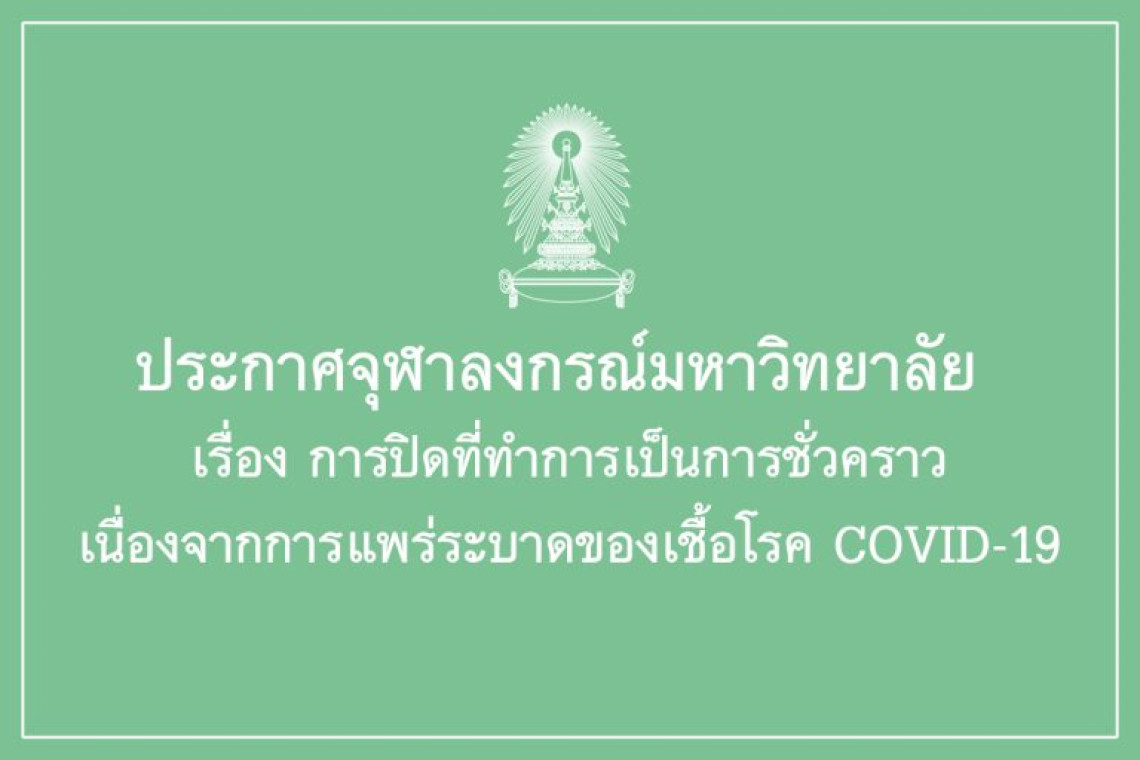 เมื่อวันที่ 21 มี.ค.63 จุฬาลงกรณ์มหาวิทยาลัย ได้ออกประกาศสืบเนื่องจากมีผู้ติดเชื้อโควิด-19 ในอัตราที่สูงขึ้นต่อเนื่อง จึงเห็นสมควรกำหนดมาตรการเพื่อลดโอกาสไม่ให้เชื้อแพร่ระบาดไปยังนิสิต บุคลากร และประชาชน จึงออกประกาศ ให้มหาวิทยาลัยปิดที่ทำการที่ในเขตกรุงเทพมหานครเป็นการชั่วคราว 22 วัน ตั้งแต่วันที่ 22 มี.ค.-12 เม.ย.63 รวมทั้งให้นิสิตและบุคลากรหลีกเลี่ยงออกจากสถานที่พักอาศัย รวมทั้งการเดินทางไปยังที่ชุมนุมชน หรือพบปะบุคคลอื่นโดยไม่มีเหตุจำเป็น และมีหน้าที่ติดตามข่าวสารจากมหาวิทยาลัยอย่างใกล้ชิด รวมทั้งให้จัดการเรียนการสอนทุกรายวิชาในรูปแบบออนไลน์