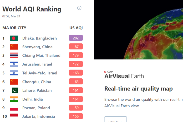 ด้าน www.airvisual.com ซี่งรายงานคุณภาพอากาศและจัดอันดับเมืองมลพิษ โดยรายงานแบบเรียลไทม์ วันที่ 24 มี.ค.63 เวลา 07.52 น. ซึ่งเช้านี้ เมืองเชียงใหม่ อยู่ในลำดับที่ 3 ของโลก ค่าฝุ่นอยู่ที่ 172 US AQI และกทม. อยู่ในลำดับที่ 48 ค่าฝุ่นอยู่ที่ 59 US AQi