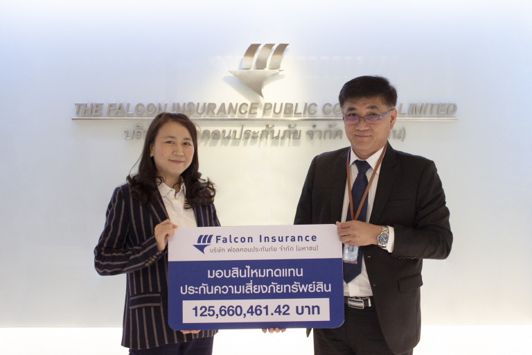 คุณอำนาจ มาตรง ผู้อำนวยการอาวุโสฝ่ายกฏหมายและสินไหม เป็นตัวแทน บริษัท ฟอลคอนประกันภัย จำกัด (มหาชน) ในฐานะผู้รับประกันภัยร่วมกรมธรรม์ประกันความเสี่ยงภัยทรัพย์สิน ห้างสรรพสินค้าเซ็นทรัลเวิลด์ ในสัดส่วน 45% ได้มอบสินไหมทดแทนจำนวน 125,660,461.42 บาท จากกรณีเหตุเพลิงไหม้ห้างดังกล่าว โดยมี คุณพัชพร แผ้วมานะกุล ผู้อำนวยการฝ่ายสินไหมทดแทน บริษัท เซ็นทรัล อินชัวรันส์ เซอร์วิสเซส จำกัด ในฐานะนายหน้าประกันภัยของบริษัท เซ็นทรัลพัฒนา จำกัด (มหาชน) เป็นตัวแทนรับมอบ