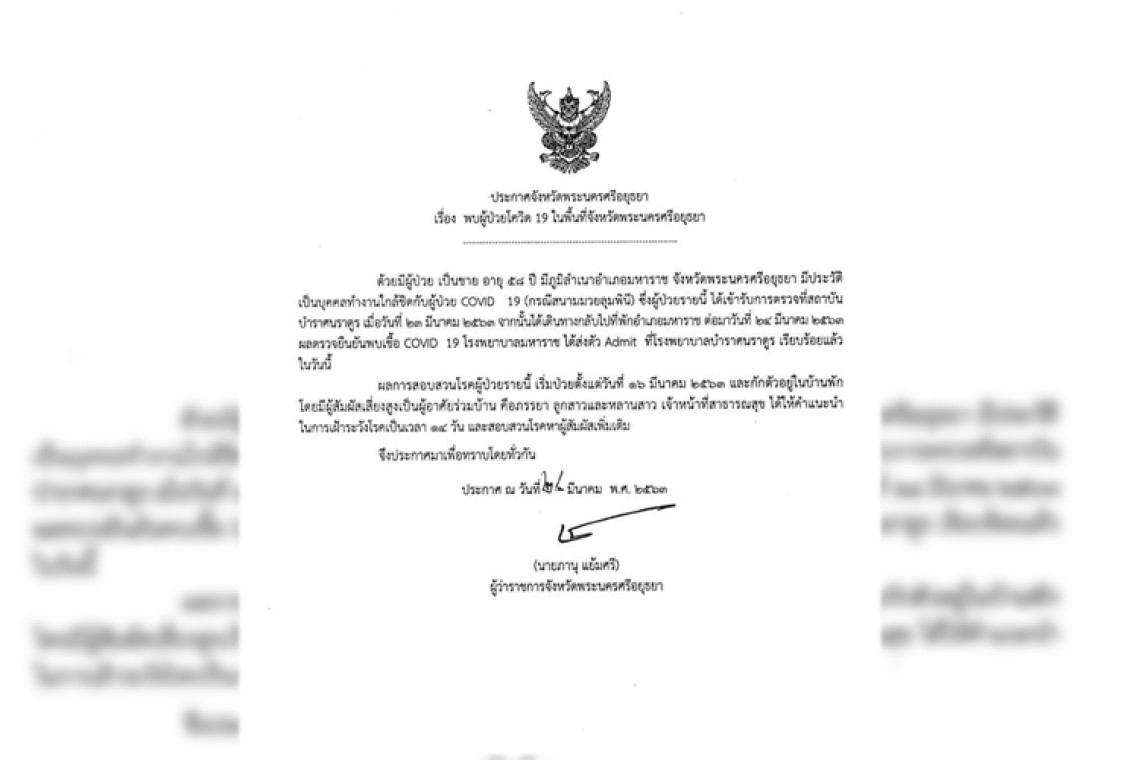 เพจจังหวัดพระนครศรีอยุธยา โพสต์ประกาศจังหวัดพระนครศรีอยุธยา โดยมีรายละเอียดว่า...ประกาศจังหวัดพระนครศรีอยุธยา พบผู้ป่วย COVID-19 ยืนยันหนึ่งรายมีภูมิลำเนาในพื้นที่อำเภอมหาราช โดยมีการสัมผัสใกล้ชิดกับผู้ป่วยจากสนามมวยลุมพินี โดยปัจจุบันเข้ารับการรักษาอยู่ที่ร.พ.บำราศนราดูร