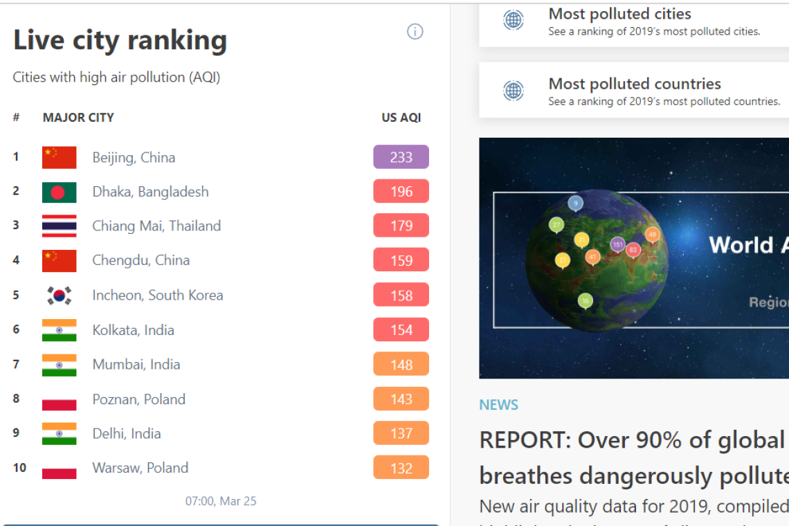 ขณะที่ www.airvisual.com ซึ่งรายงานคุณภาพอากาศและจัดอันดับเมืองมลพิษ โดยรายงานแบบเรียลไทม์วันที่ 25 มี.ค.63 เวลา 07.00 น. พบว่าเมืองเชียงใหม่ อยู่ในลำดับที่ 3 ของโลก ค่าฝุ่นอยู่ที่ 179 US