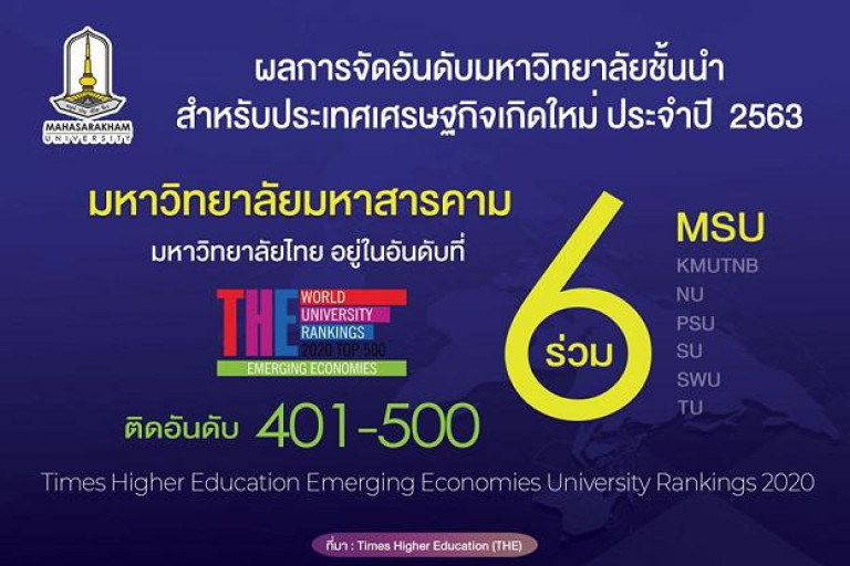 รศ.ดร.ประยุกต์ ศรีวิไล อธิการบดีมหาวิทยาลัยมหาสารคามเปิดเผยว่าTimes Higher Education (THE) สถาบันจัดอันดับชั้นนำของโลกได้ประกาศผลการจัดอันดับมหาวิทยาลัยชั้นนำสำหรับประเทศเศรษฐกิจเกิดใหม่ ประจำปี 2020หรือTimes Higher Education Emerging Economies University Rankings 2020 โดย มหาวิทยาลัยมหาสารคาม (มมส) ติดอันดับ401-500และอยู่ในอันดับที่ 6ของมหาวิทยาลัยในประเทศไทย ร่วมกับ มหาวิทยาลัยเทคโนโลยีพระจอมเกล้าพระนครเหนือ มหาวิทยาลัยนเรศวร มหาวิทยาลัยสงขลานครินทร์ มหาวิทยาลัยศิลปากร มหาวิทยาลัยศรีนครินทรวิโรฒ และมหาวิทยาลัยธรรมศาสตร์