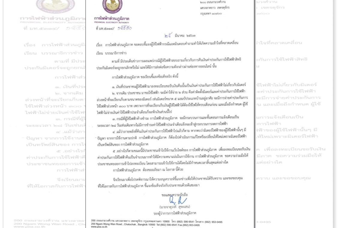 เมื่อวันที่ 25 มี.ค.63 การไฟฟ้าส่วนภูมิภาคหรือ PEA ทำหนังสือลงนามโดย นายจาตุรงค์ สุขะเสน รองผู้ว่าการการไฟฟ้าส่วนภูมิภาค ชี้แจงกรณีแอดมินตอบคำถามทำให้เกิดความเข้าใจที่คลาดเคลื่อน โดยระบุว่า ตามที่มีประเด็นข่าวการเผยแพร่กรณีผู้ใช้ไฟฟ้าสอบถามเกี่ยวกับการคืนเงินค่าประกันการใช้ไฟฟ้าสิทธิประกันมิเตอร์จะถูกยกเลิกหรือไม่ และได้มีการส่งต่อข้อความดังกล่าวผ่านช่องทางออนไลน์นั้นการไฟฟ้าส่วนภูมิภาคขอเรียนชี้แจงข้อเท็จจริงดังนี้