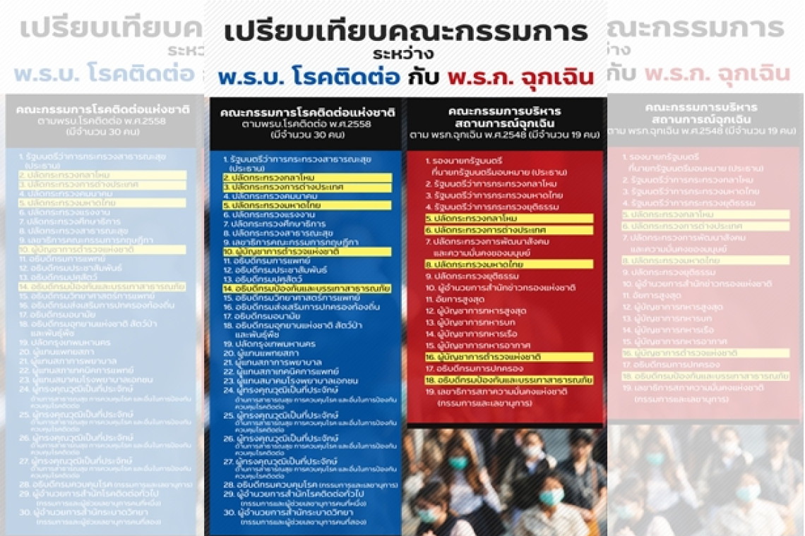 เมื่อ พรก.ฉุกเฉิน ถูกนำมาใช้แก้ไขปัญหาโรคติดต่ออันตราย ไวรัส COVID-19 ตามที่รัฐบาลได้ประกาศใช้ พรก.การบริหารราชการในสถานการณ์ฉุกเฉิน พ.ศ.2548 มาใช้ในการแก้ปัญหาโรคระบาด ทั้งที่มีอำนาจในการบริหารสถานการณ์ภายใต้ พรบ.โรคติดต่อ พ.ศ.2558 ที่บัญญัติขึ้นเพื่อการป้องกันและการควบคุมโรคติดต่ออยู่แล้ว สาระสำคัญของกฎหมาย 2 ฉบับนี้ มีความแตกต่างกันอย่างมากทั้งในเชิงปรัชญา กลไกและความเชี่ยวชาญของผู้ใช้อำนาจบริหาร โดย พรบ.โรคติดต่อ พ.ศ.2558 มี “คณะกรรมการโรคติดต่อแห่งชาติ” จำนวน 30 คน ส่วน พรก. ฉุกเฉิน มี “คณะกรรมการบริหารสถานการณ์ฉุกเฉิน” จำนวน 19 คน ทั้ง 2 คณะกรรมการ จะมีตำแหน่งซ้ำกันอยู่ 5 ตำแหน่ง คณะกรรมการโรคติดต่อแห่งชาติ อีก 25 ตำแหน่งที่ไม่ซ้ำกัน จะมีหน้าที่ในการป้องกัน รักษาและขจัดโรคติดต่อเป็นส่วนใหญ่ อาทิ รมว. สาธารณสุข, ปลัดกระทรวงสาธารณะสุข, อธิบดีกรมการแพทย์, อธิบดีกรมวิทยาศาสตร์การแพทย์, อธิบดีกรมอนามัย, ผู้แทนแพทยสภา, ผู้แทนสภาการพยาบาล, ผู้แทนสมาคมโรงพยาบาลเอกชน โดยมีอธิบดีกรมควบคุมโรค เป็นกรรมการและเลขานุการ ขณะที่องค์ประกอบหลักของคณะกรรมการบริหารสถานการณ์ฉุกเฉิน จะเป็นตำแหน่งผู้บังคับบัญชาทหารทั้ง 3 เหล่าทัพ และหน่วยงานด้านความมั่นคง เป็นส่วนใหญ่ พรก.ฉุกเฉิน มีจุดกำเนิดเพื่อแก้ปัญหาความไม่สงบในจังหวัดชายแดนภาคใต้ ในปี พ.ศ.2548 ภายหลักเหตุการณ์วางระเบิดเมืองยะลาเป็นเหตุให้ไฟฟ้าดับทั้งตัวเมืองติดต่อเป็นเวลานาน จึงได้กำหนด พรก. ฉุกเฉิน ขึ้นใช้บังคับต่อเนื่องมาถึงปัจจุบัน ส่วน พรบ. โรคติดต่อนั้น เกิดขึ้นจากการที่ประเทศไทยเข้าเป็นภาคีรับพันธะกรณีกติการะหว่างประเทศว่าด้วยสิทธิทางเศรษฐกิจ สังคม และวัฒนธรรมที่กำหนดเรื่องการป้องกัน รักษาและควบคุมโรคระบาด มีจุดเด่นในการกระจายอำนาจให้คณะกรรมการโรคติดต่อจังหวัด มีทั้งนายกเทศมนตรี นายกองค์การบริหารส่วนตำบล ผู้อำนวยการโรงพยาบาลศูนย์หรือผู้อำนวยการโรงพยาบาลทั่วไป โรงพยาบาลชุมชน สาธารณสุขอำเภอ ที่อยู่กับปัญหาและมีหน้าที่โดยตรงเป็นคณะกรรมการระดับจังหวัดด้วย ดังนั้น การป้องกัน รักษาและควบคุมโรคระบาด ปรัชญา ที่มา และการดำเนินการ อีกทั้งความรู้ที่ใช้ จะเป็นเรื่องการสาธารณสุข การแพทย์ พยาบาล เภสัชศาสตร์ นักวิทยาศาสตร์ การวิเคราะห์ วิจัย ค้นคว้าเป็นส่วนใหญ่ จึงแตกต่างกับ พรก. ฉุกเฉิน อย่างสิ้นเชิง แต่อย่างไรก็ตาม การประกาศ พรก.ฉุกเฉิน อาจมีข้อดีที่ทำให้ประชาชนตระหนักรู้ว่าสถานการณ์ที่สังคมไทยและโลกเผชิญอยู่เป็นภัยพิบัติจากโรคติดต่ออันตรายรุนแร