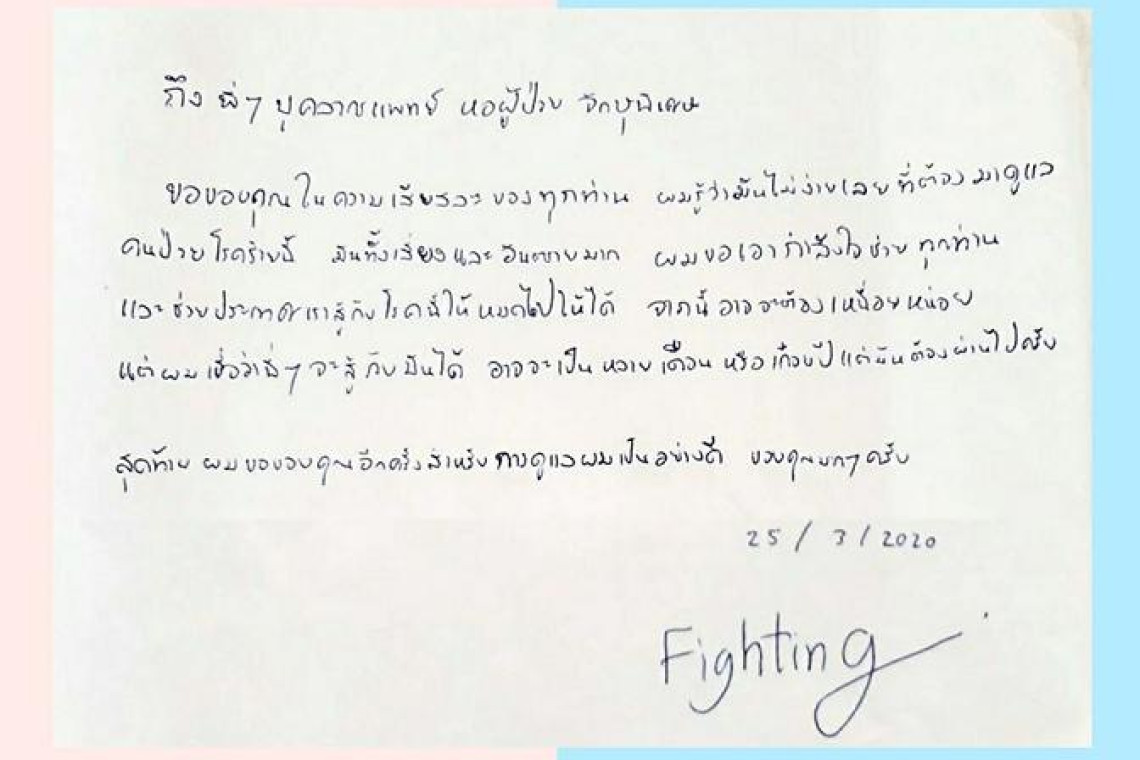 กรมการแพทย์ โพสต์ผ่านเฟซบุ๊ก จดหมายขอบคุณจากใจผู้ป่วยโควิด-19 ส่งถึงบุคลากรการแพทย์ กระทรวงสาธารณสุข #ทุกลมหายใจที่ได้คืนมามีค่ามากเกินกว่าคำชื่นชม “ถึงพี่ๆ บุคลากรแพทย์หอผู้ป่วย จักษุพิเศษ ขอขอบคุณในความเสียสละของทุกคน ผมรู้ว่ามันไม่ง่ายเลยที่ต้องมาดูแลคนป่วยโรคร้ายนี้ มันทั้งเสี่ยงและอันตรายมาก ผมขอเอากำลังใจช่วยทุกท่าน และช่วยประเทศเราสู้กับโรคนี้ให้หมดไปให้ได้ จากนี้อาจจะต้องเหนื่อยหน่อย แต่ผมเชื่อว่าพี่ๆ จะสู้กับมันได้ อาจจะเป็นหลายเดือนหรือเกือบปี แต่มันต้องผ่านไปครับ สุดท้ายผมขอขอบคุณอีกครั้ง สำหรับการดูแลผมเป็นอย่างดี ขอบคุณมากๆ ครับ 25/3/2020 Fighting”