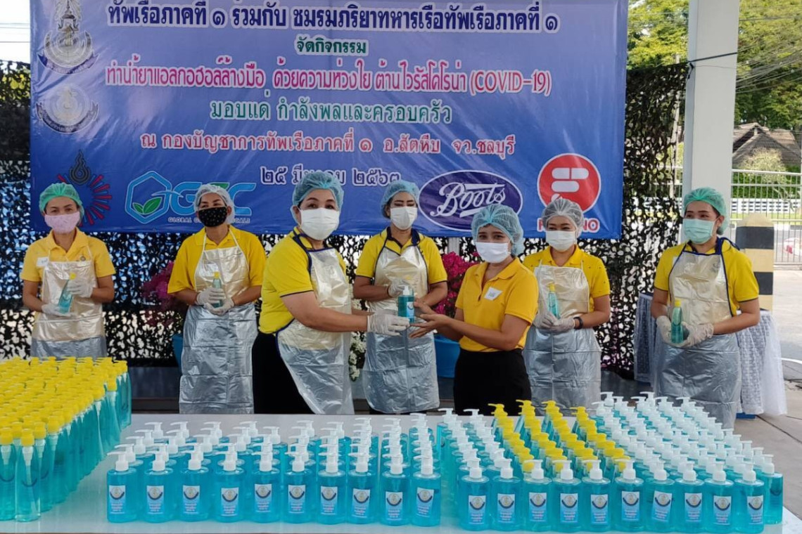 กองทัพเรือ โดยทัพเรือภาคที่ 1 นำทีมชมรมภริยาทหารเรือทัพเรือภาคที่ 1 สมาคมภริยาทหารเรือ ร่วมผลิตนำ้ยาแอลกอฮอล์ล้างมือฆ่าเชื้อไวรัส COVID 19 แจกจ่ายกำลังพลและครอบครัว รวมถึงร่วมทำกิจกรรมสาธารณะประโยชน์ ในวันนี้ 26 มี.ค.63 พลเรือโท สุทธินันท์ สมานรักษ์ ผู้บัญชาการทัพเรือภาคที่ 1 และคุณสุนันท์ สมานรักษ์ ประธานชมรมภริยาทหารเรือทัพเรือภาคที่ 1 สมาคมภริยาทหารเรือ ได้นำคณะชมรมภริยาทหารเรือทัพเรือภาคที่ 1 และข้า ราชการของทัพเรือภาคที่ 1 ร่วมกันผลิตน้ำยาแอลกอฮอล์ล้างมือฆ่าเชื้อไวรัส COVID 19 แจกจ่ายให้กับกำลังพล และครอบครัวในทัพเรือภาคที่ 1 ณ กองบัญชสการทัพเรือภาคที่ 1 อ.สัตหีบ จ.ชลบุรี รวมทั้งสนับสนุนกิจกรรมสาธารณประ โยชน์ในพื้นที่อำเภอสัตหีบ เพื่อใช้ในการป้องกันตนเองและบุคคลในครอบครัวหรือหน่วยงาน ทั้งนี้ทัพเรือภาคที่ 1 ได้รับการสนับ สนุนจาก กองเรือยุทธการ มอบแอลกอ ฮอล์เหลว จำนวน 200 ลิตร บริษัท โกลบอลกรีน เคมิคอล จำกัด (มหาชน) มอบ สารตั้งต้น ที่มีส่วนผสมในการผลิตสบู่ เหลว และนำ้ยาแอลกอฮอล์ล้างมือฆ่าเชื้อไวรัส COVID 19 ได้แก่ สารกลีเซอรอล จำนวน 20 กิโลกรัม โดยมีผู้ช่วยศาสตราจารย์ ด๊อกเตอร์ ศุภวรรณ บุญระเทพ วิทยาลัยเภสัช ศาสตร์มหาวิทยาลัยรังสิต ให้เกียรติมาเป็นวิทยากรบรรยายพิเศษ และแนะนำวิธีการผลิตนำ้ยา แอลกอฮอล์ล้างมือฆ่าเชื้อไวรัส COVID 19 พร้อมให้ข้อมูลความรู้ในเรื่องดังกล่าวนี้อีกด้วย ภาพ/ข่าว: กองกิจการพลเรือน ทัพเรือภาคที่ 1