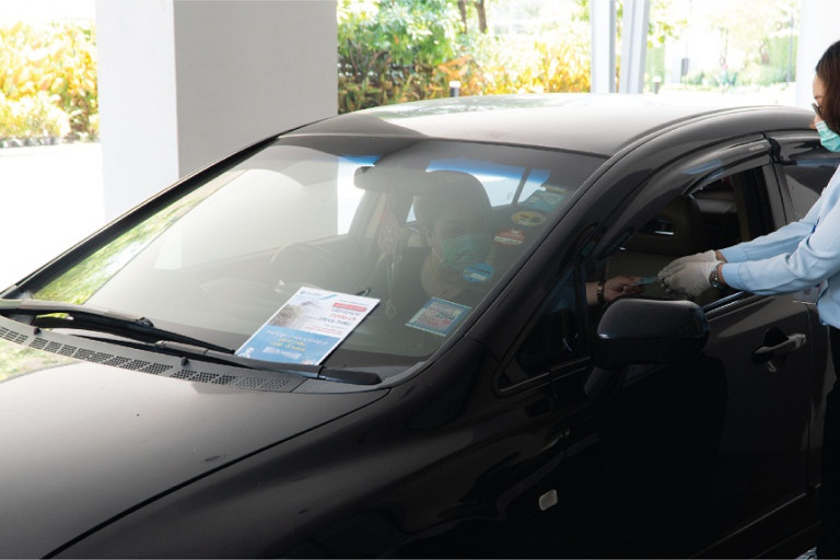 1. ตั้งจุดตรวจที่บริเวณประตูทางเข้าจุดรับส่งผู้ป่วยซึ่งผู้ที่ต้องการตรวจสามารถขับรถยนต์หรือนั่งรถส่วนบุคคล ผ่านเข้าจอดโดยไม่ต้องลงจากรถ เพียงแค่เปิดหน้าต่าง โดยเริ่มจากจุดที่ 1 ทำการคัดกรองและซักประวัติ