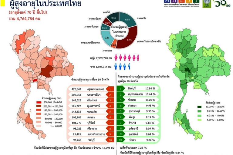 ทั้งนี้ ประชากรของประเทศไทยที่มีอายุตั้งแต่ 70 ปีขึ้นไป มีจำนวน 4,764,684 คน เป็นเพศชาย 1,804,914 คน คิดเป็น 38% เพศหญิง 2,959,770 คน คิดเป็น 62% กระจายอยู่ในแต่ละภูมิภาคของประเทศ ประกอบด้วย กรุงเทพมหานคร 425,847 คน ปริมณฑล 380,612 คน ภาคกลางยกเว้น กทม.และปริมณฑล 241,023 คน ภาคตะวันออกเฉียงเหนือ 1,547,872 คน ภาคเหนือ 977,312 คน ภาคใต้ 591,581 คน ภาคตะวันออก 311,557 คน และภาคตะวันตก 288,881 คน จังหวัดที่มีประชากรผู้สูงอายุ 10 อันดับแรกของประเทศ ได้แก่ กรุงเทพมหานคร นครราชสีมา เชียงใหม่ อุบลราชธานี ขอนแก่น สงขลา บุรีรัมย์ เชียงรายนครศรีธรรมราช และชลบุรี ตามลำดับ และเมื่อคิดตามสัดส่วนของประชากรผู้ที่มีอายุ 70 ปีขึ้นไปมีสัดส่วนถึง 7.25% ของประชากรทั้งหมด โดยจังหวัดที่มีสัดส่วนผู้ที่มีอายุมากกว่า 70 ปีต่อประชากรมากที่สุด ได้แก่ สิงห์บุรี สมุทรสงคราม ชัยนาท อ่างทอง สุพรรณบุรี พัทลุง ลำปาง อุทัยธานี อุตรดิตถ์ และพิจิตร ตามลำดับ