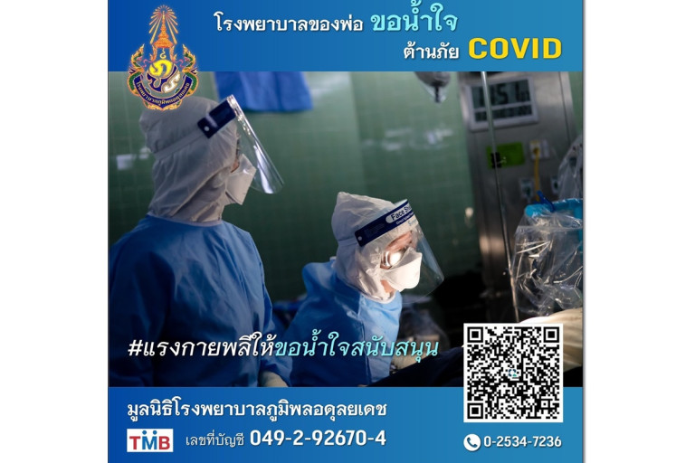 โรงพยาบาลภูมิพลอดุลยเดช ขอเชิญร่วมบริจาคเพื่อซื้ออุปกรณ์ทางการแพทย์  รักษา COVID-19  โดยการโอนเงินเข้าบัญชี "มูลนิธิโรงพยาบาลภูมิพลอดุลยเดช"  ธนาคารทหารไทย เลขที่บัญชี 049-2-92670-4  สอบถามข้อมูลเพิ่มเติม โทร. 0-2534-7236 หรือ Facebook : โรงพยาบาลภูมิพลอดุลยเดช พอ.