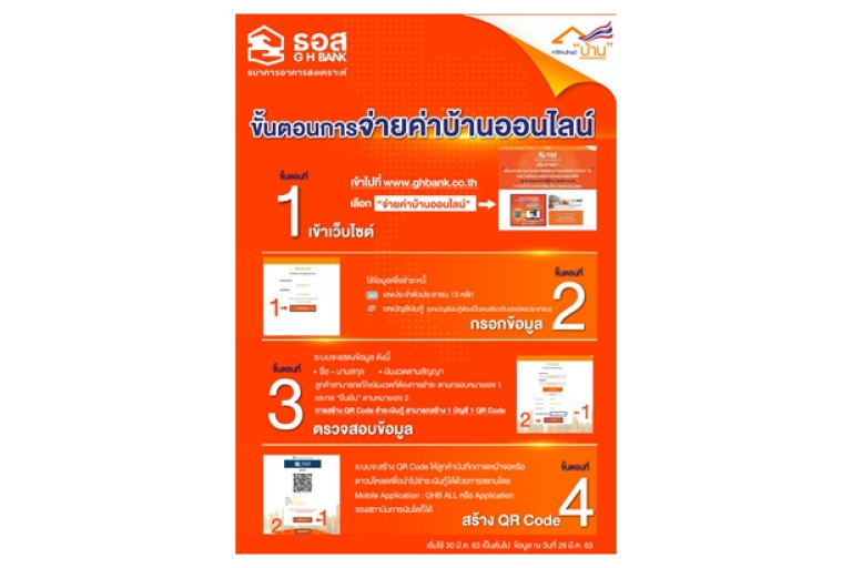 ทั้งนี้ ธอส.ได้เพิ่มช่องทางใหม่ในการชำระเงินกู้ออนไลน์ได้ง่ายๆที่ใดก็ได้ด้วยโทรศัพท์มือถือของตัวท่านเองหรือเครื่องคอมพิวเตอร์ที่บ้าน เพียงเข้าไปที่เว็บไซต์ธนาคารอาคารสงเคราะห์ www.ghbank.co.th จากนั้นเลือกระบบ “จ่ายค่าบ้านออนไลน์” และปฏิบัติตามขั้นตอน โดยระบุข้อมูลคือ เลขประจำตัวประชาชน 13 หลัก และเลขที่บัญชีเงินกู้ จากนั้นระบบจะแสดงข้อมูลของลูกค้าและจำนวนเงินกู้ที่ต้องชำระ เมื่อลูกค้ายืนยันความถูกต้องของข้อมูล ระบบจะสร้าง QR Code สำหรับการชำระเงินกู้ในแต่ละครั้งให้ลูกค้าสามารถเลือกดาวน์โหลดหรือสแกนเพื่อชำระเงินกู้ของ ธอส.ได้ทันทีด้วย Mobile Application : GHB ALL ของ ธอส.หรือของธนาคารใดก็ได้ภายในระยะเวลาที่กำหนด โดยไม่จำเป็นต้องเดินทางไปที่สาขาของธนาคาร ทั้งนี้สามารถใช้บริการระบบดังกล่าวได้ตั้งแต่วันนี้เป็นต้นไป