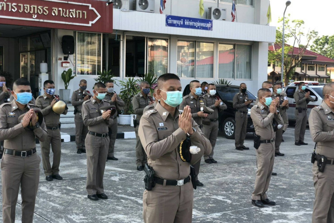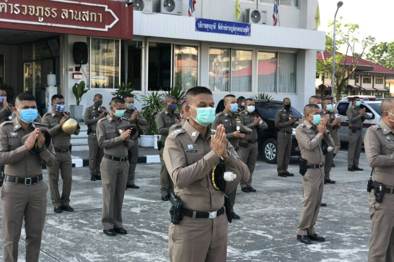 เรียกแถวข้าราชการ ตำรวจ สภ.ลานสกา สายตรวจรถยนต์ รถจักรยานยนต์ (ผลัดเก่า - ใหม่), จราจร เข้าแถว ห่างกัน 2 เมตรเคารพธงชาติ สวดมนต์ไหว้พระ กล่าวคำปฏิญาณ บทธงชัย อุดมคติตำรวจ ตรวจความเรียบร้อย อุปกรณ์ป้องกัน Covid 19 ชี้แจงภารกิจ อบรมปล่อยแถว