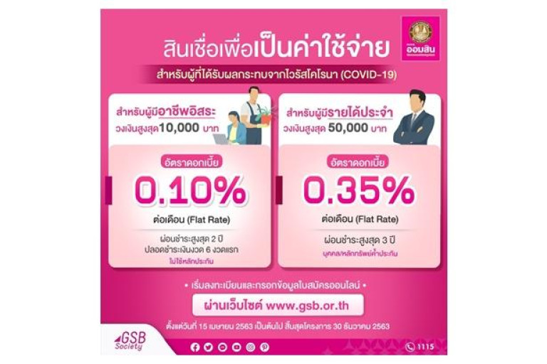 นายชาติชาย พยุหนาวีชัย ผู้อำนวยการ ธนาคารออมสิน เปิดเผยว่า ตามที่ธนาคารออมสินได้แจ้งประชาสัมพันธ์เรื่อง เปิดให้บริการสินเชื่อเพื่อเป็นค่าใช้จ่ายสำหรับผู้มีอาชีพอิสระที่ได้รับผลกระทบจากไวรัสโคโรนา (โควิด-19) และ สินเชื่อเพื่อเป็นค่าใช้จ่ายสำหรับผู้มีรายได้ประจำที่ได้รับผลกระทบจากไวรัสโควิด-19 โดยเปิดให้ลงทะเบียนแจ้งความจำนงใช้บริการผ่านเว็บไซต์ธนาคารออมสิน ในวันที่ 1 เม.ย.63 เป็นต้นไป และ ให้เริ่มกรอกข้อมูลใบสมัครออนไลน์ผ่านเว็บไซต์ธนาคารออมสิน ได้ตั้งแต่วันที่ 15 เม.ย.63 เป็นต้นไป นั้น