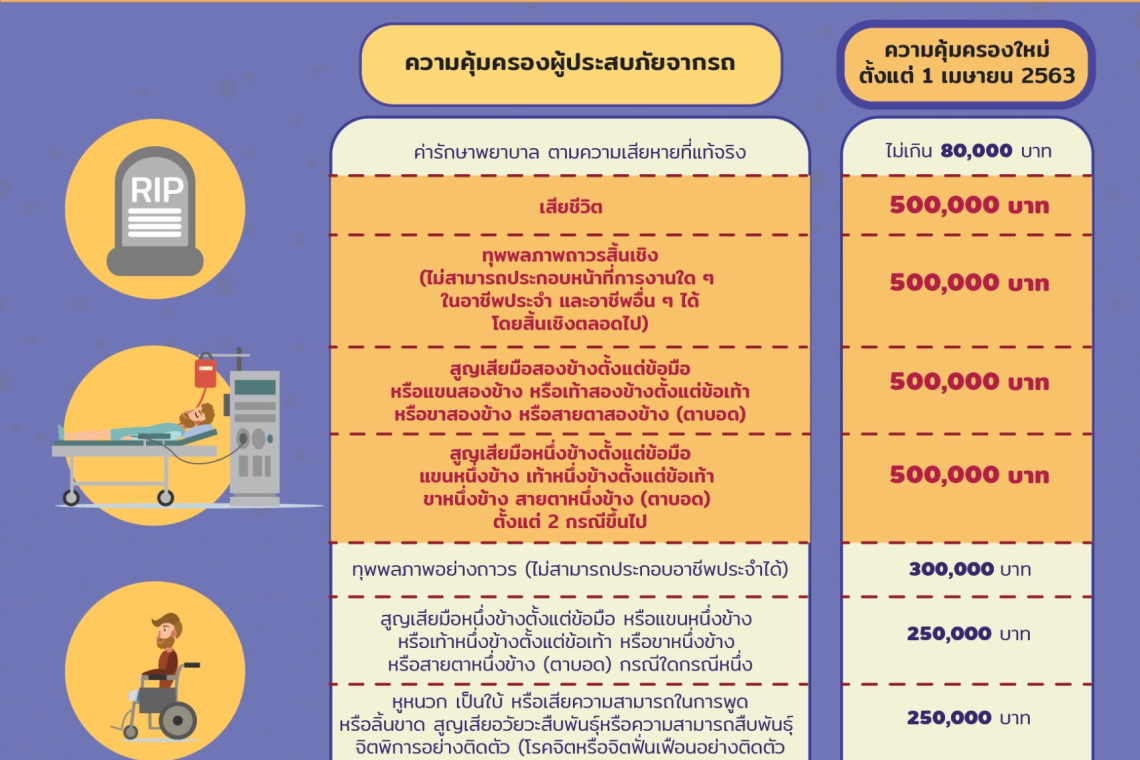 อย่าลืม!! วันที่ 1 เมษายน 2563 ประกันภัย พ.ร.บ. ปรับเพิ่มความคุ้มครองเป็น 500,000 บาท โดยไม่ขึ้นค่าเบี้ยประกันภัย และประกันภัยรถยนต์ภาคสมัครใจ ปรับเพิ่มความคุ้มครองขั้นต่ำไม่น้อยกว่า 500,000 บาท สมาคมประกันวินาศภัยไทย ย้ำเตือนผู้ใช้รถใช้ถนนทุกคนรู้ถึงสิทธิประโยชน์ที่ได้รับ จากการปรับเพิ่มวงเงินความคุ้มครองของประกันภัย พ.ร.บ. ว่า ตามที่สมาคมประกันวินาศภัยไทย ร่วมกับ สำนักงาน คปภ. กำหนดหลักเกณฑ์การชดใช้ค่าสินไหมทดแทนโดยปรับเพิ่มความคุ้มครองประกันภัยรถยนต์ภาคบังคับ หรือ ประกันภัย พ.ร.บ. คำสั่งนายทะเบียนที่ 10/2563 เรื่อง ให้ใช้แบบ ข้อความกรมธรรม์ประกันภัยคุ้มครองผู้ประสบภัยจากรถ กรมธรรม์ประกันภัยรถยนต์ กรมธรรม์ประกันภัยรถยนต์รวมการคุ้มครองผู้ประสบภัยจากรถ เอกสารแนบท้ายกรมธรรม์ประกันภัย และพิกัดอัตราเบี้ยประกันภัยรถยนต์ โดยมีผลใช้บังคับตั้งแต่วันที่ 1 เมษายน 2563 เป็นต้นไป ผู้ประสบภัยจากรถได้รับความเสียหายต่อชีวิต ร่างกาย หรืออนามัย ตั้งแต่วันที่ 1 เมษายน 2563 เป็นต้นไป ให้ได้รับการชดใช้ความเสียหายที่กำหนดไว้ในเงื่อนไขกรมธรรม์ประกันภัยคุ้มครองผู้ประสบภัยจากรถตามวงเงินความคุ้มครองที่ปรับเพิ่ม การปรับเพิ่มความคุ้มครองในครั้งนี้ เป็นการยกระดับมาตรฐานในการพิจารณาชดใช้ค่าสินไหมทดแทน เพื่อให้ผู้ประสบภัยจากรถทุกคนมีหลักประกันความเสียหายต่อชีวิต ร่างกาย หรืออนามัย อย่างเท่าเทียมกัน สำหรับผู้ที่ต้องการความคุ้มครองที่มากขึ้น หรือต้องการความคุ้มครองทั้งชีวิตและทรัพย์สินด้วย แนะนำให้ทำประกันภัยรถยนต์ภาคสมัครใจควบคู่กันไป ซึ่งปัจจุบันมีให้เลือกหลายรูปแบบ โดยจะให้ความคุ้มครองและมีค่าเบี้ยประกันภัยที่แตกต่างกันไป ดังนั้น ควรเลือกทำประกันภัยรถยนต์ภาคสมัครใจให้เหมาะกับความเสี่ยงในการใช้รถ หรือเลือกความคุ้มครองที่ต้องการ ที่สำคัญควรคำนึงถึงความสามารถในการจ่ายเบี้ยประกันภัยในแต่ละปีอีกด้วย ซึ่งกรมธรรม์ประกันภัยรถภาคสมัครใจนั้น ได้มีการปรับเพิ่มความคุ้มครองขั้นต่ำไม่น้อยกว่า 500,000 บาท หากรถคันที่ประสบอุบัติเหตุมีทั้งกรมธรรม์ประกันภัย พ.ร.บ. และกรมธรรม์ประกันภัยรถยนต์ภาคสมัครใจ ผู้ประสบภัยที่เสียชีวิต หรือทุพพลภาพถาวรสิ้นเชิง จะได้รับการชดใช้ค่าสินไหมทดแทนขั้นต่ำ 1,000,000 บาท ต่อราย ทุกวันนี้ การใช้รถใช้ถนนในชีวิตประจำวันของเรานั้นมีโอกาสที่จะเกิดอุบัติเหตุได้ตลอดเวลา ดังนั้น ผู้ใช้รถใช้ถนนทุกคนควรเพิ่มความระมัดระวังในการขับขี่ และขับขี่รถด้วยความไม่ประมาท เพื่อป้องกันอุบัติเหตุที่อาจเ
