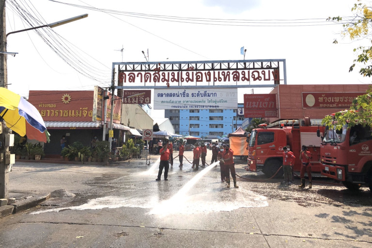 1. ล้าง : ฝ่ายป้องกันและบรรเทาสาธารณภัย จัดรถบรรทุกน้ำฉีดบนทางและพื้นตลาด