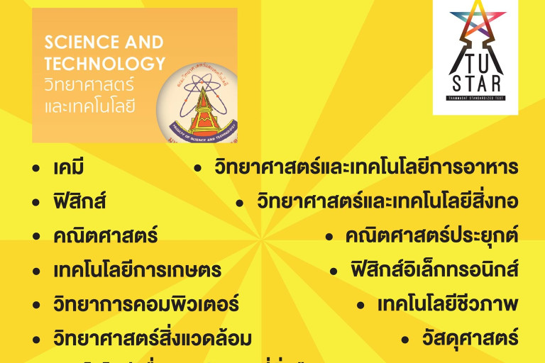 รายงานข่าวจากมหาวิทยาลัยธรรมศาสตร์ (มธ.) แจ้งว่า คณะวิทยาศาสตร์และเทคโนโลยี มธ.กำลังเปิดรับสมัครสอบ TU STAR รอบที่ 3 สำหรับผู้สำเร็จการศึกษา หรือกำลังศึกษาชั้น ม.6 หรือเทียบเท่าทั้งในและต่างประเทศ เพื่อใช้สำหรับสมัครเข้าศึกษาต่อในคณะวิทยาศาสตร์และเทคโนโลยี ด้วยวิธีการรับตรง ใน 14 สาขา ได้แก่